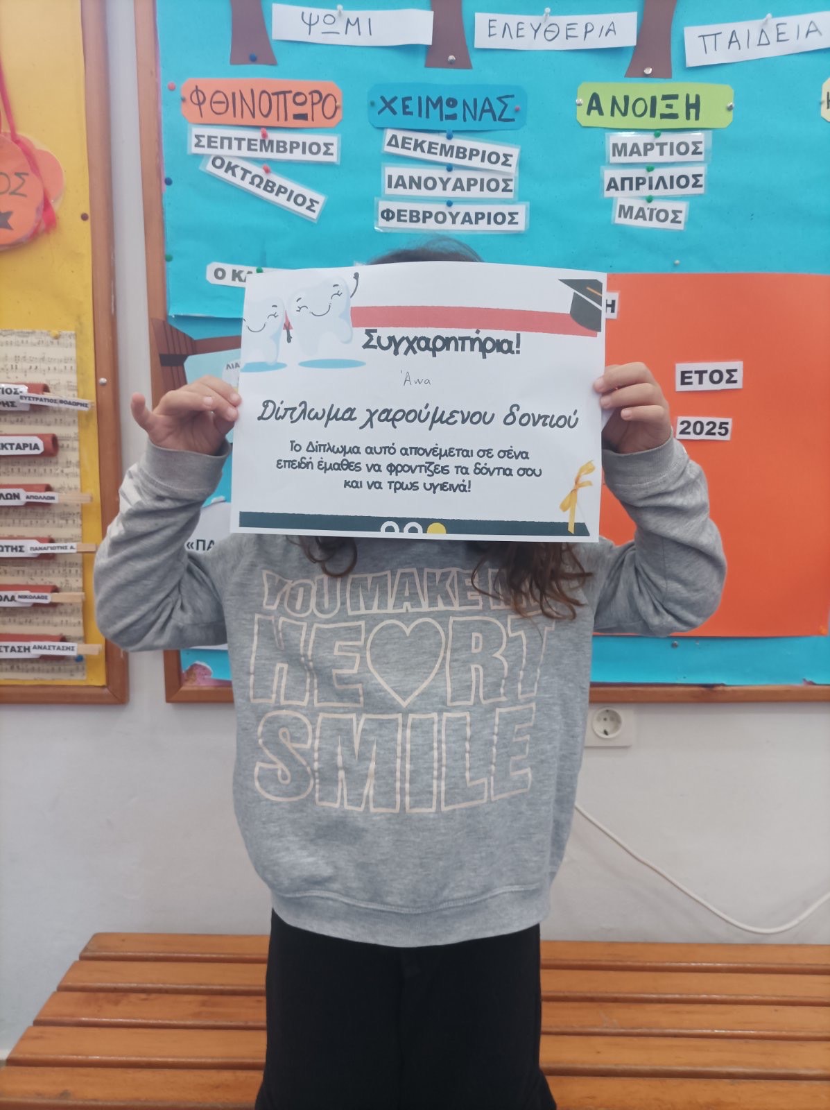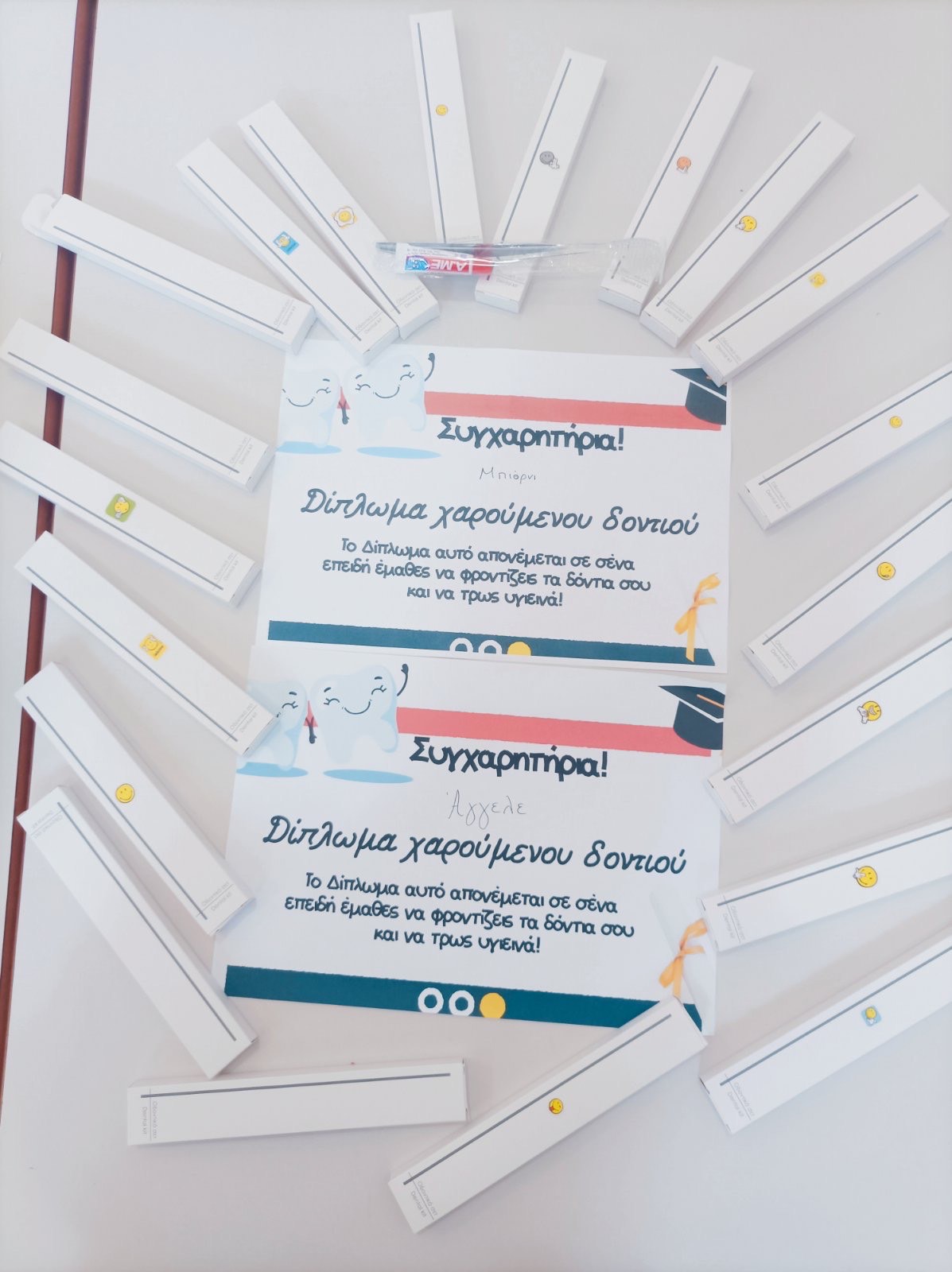 Το ταξίδι στη μεσογειακή διατροφή! Η τελευταία δράση ήταν το πρόγραμμα βουρτσίσματος που τα ακολούθησε στο σπίτι και η συνέπεια τους επιβραβεύτηκε με το “Δίπλωμα χαρούμενου δοντιού” και δώρο οδοντόβουρτσα με οδοντόκρεμα.