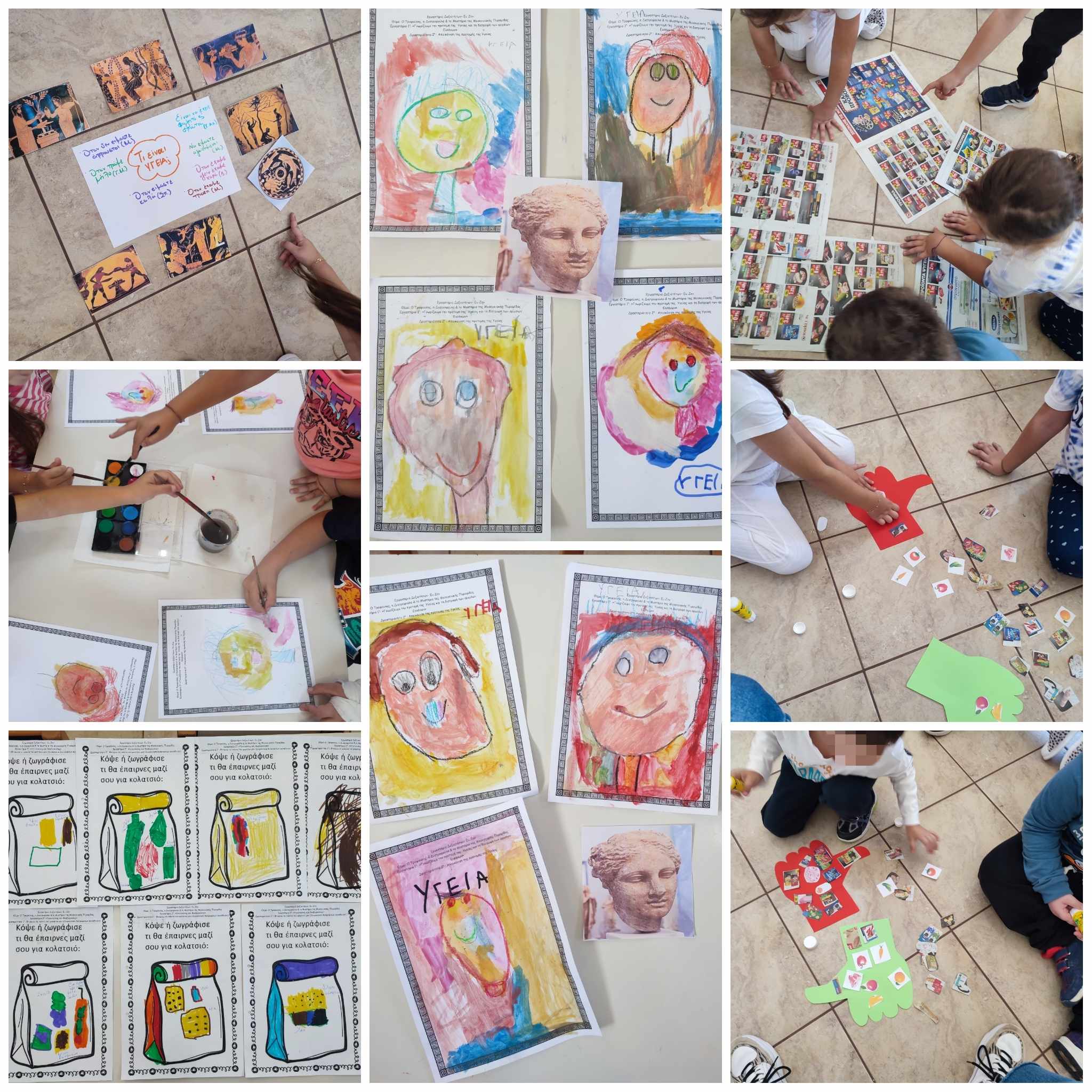 Στην αρχή του εργαστηρίου συζητήσαμε για την υγεία (τι είναι υγεία;, πότε έχουμε καλή υγεία;, ποιες τροφές μας βοηθάνε σ’ αυτό;) και αποτυπώσαμε τις ιδέες των παιδιών σε ένα ιστόγραμμα. Έπειτα, παρατηρήσαμε εικόνες διατροφής στην αρχαία Ελλάδα και συζητήσαμε ομοιότητες και διαφορές με την διατροφή στη σημερινή εποχή. Είδαμε πώς οι αρχαίοι Έλληνες απεικόνιζαν την Υγεία, γνωρίσαμε την προτομή της και την αποτυπώσαμε εικαστικά.