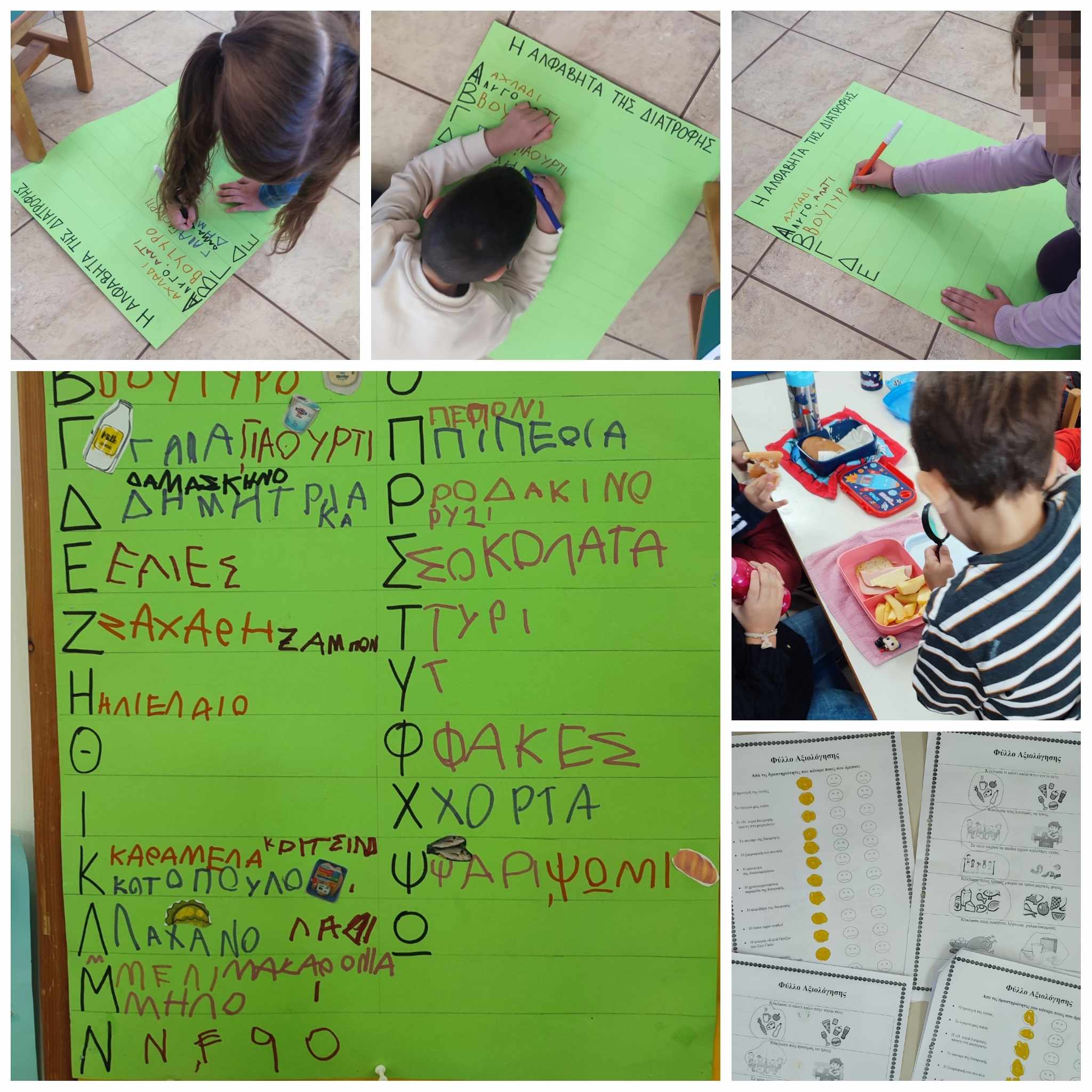 Φτιάξαμε την αλφαβήτα της διατροφής και ατομικές λίστες super- market. Γίναμε ντεντέκτιβ κρυμμένης ζάχαρης, μια δραστηριότητα που μας άρεσε πολύ και την εντάξαμε στην ώρα του δεκατιανού μας. Φυσικά, με την ολοκλήρωση του εργαστηρίου, τα παιδιά αξιολόγησαν το πρόγραμμα σε ατομικό φύλλο αξιολόγησης.
