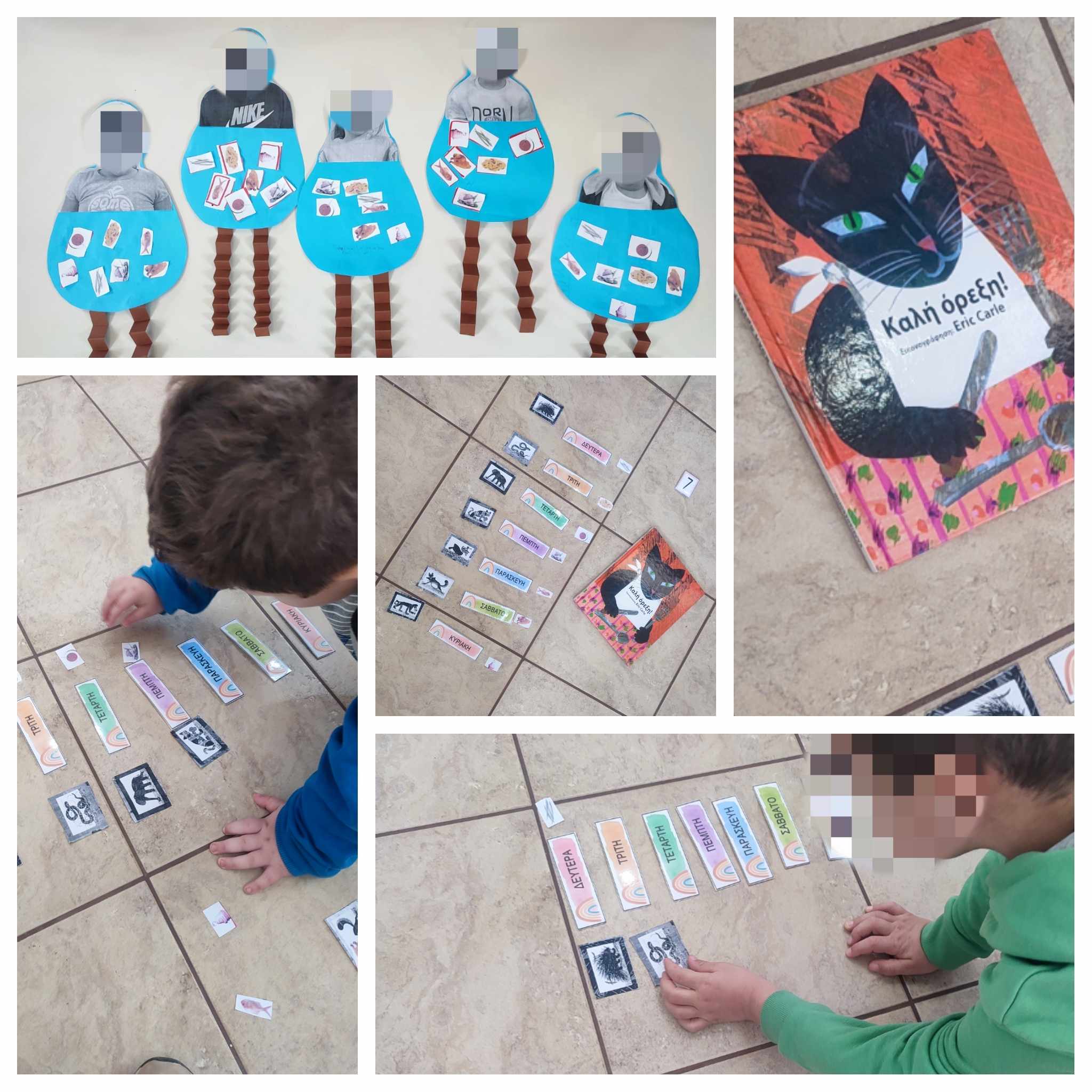 Διαβάσαμε το παραμύθι «Καλή Όρεξη» του Eric Carle. Συζητήσαμε την διατροφή των ζώων, εξασκηθήκαμε στη σειροθέτηση της ιστορίας, κάναμε αντιστοιχίσεις (ζώο- μέρα- φαγητό) και δημιουργήσαμε ατομικά mobile βασισμένα στο παραμύθι.