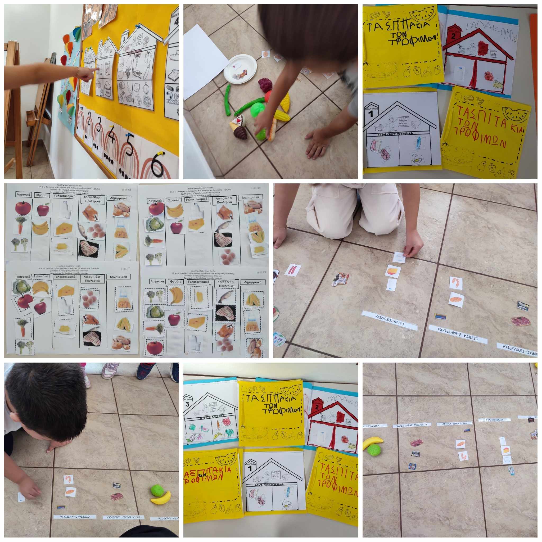 Γνωρίσαμε τις ομάδες των τροφίμων, τις ονομασίες τους και μιλήσαμε για τα οφέλη τους. Σ’ αυτό μας βοήθησε και το βιβλίο «Η κυρά Διατροφή, πρώτη στη μαγειρική» Κάναμε ομαδοποιήσεις και δημιουργήσαμε το ατομικό βιβλιαράκι με τα σπιτάκια των τροφίμων.
