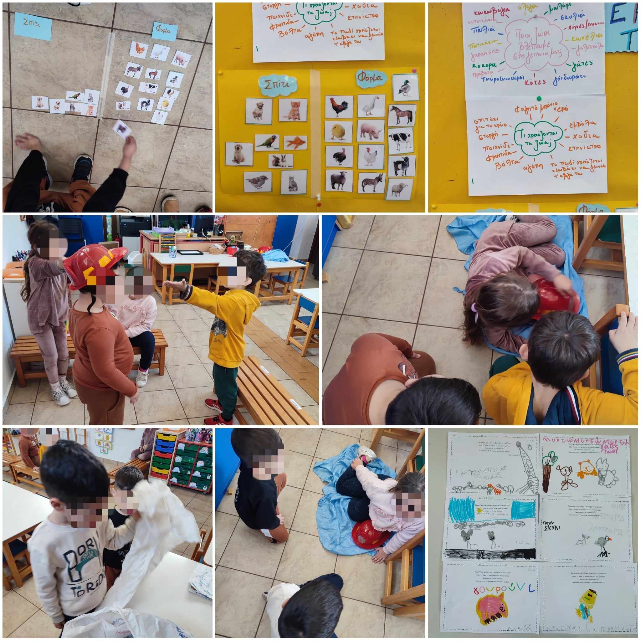 Κατά την έναρξη του εργαστηρίου μιλήσαμε για τα ζώα που βλέπουμε στη γειτονιά μας. Πολλά παιδιά είπαν ότι έχουν κάποια ζώα στο σπίτι ή στη φάρμα κι έτσι κατηγοριοποιήσαμε τα ζώα σε αυτά που έχουμε στο σπίτι και στα ζώα που έχουμε στη φάρμα. Συζητήσαμε για τις ανάγκες των ζώων, για το τιχρειάζονται απο ‘μας. Ζωγρφίσαμε το αγαπημένο μας ζώο και δραματοποιήσαμε την ιστορία «Η Γάτα η Μαρμελάδα» της Γιολάντας Τσορώνη- Γεωργιάδη.