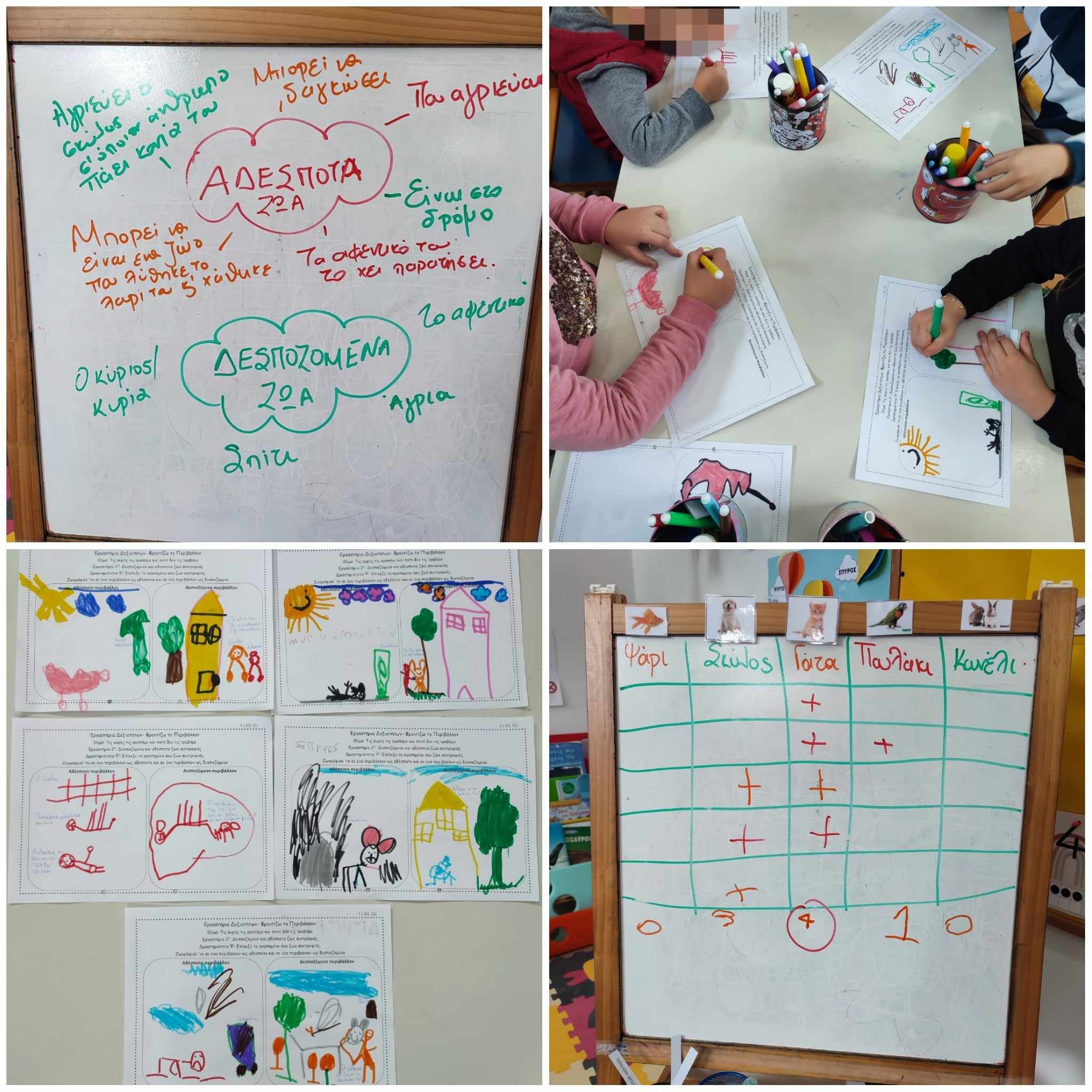 Αφού είχαμε διαχωρίσει τα ζώα συντροφιάς κα ζώα φάρμας, ψηφίσαμε το αγαπημένο μας ζώο συντροφιάς. Παρακολουθήσαμε το animation «Stray Dog-Animal Rights Animation», μιλήσαμε για τα δεσποζόμενα και αδέσποτα ζώα και ζωγραφίσαμε το αγαπημένο μας ζώο σε ένα δεσποζόμενο κι ένα αδέσποτο περιβάλλον.