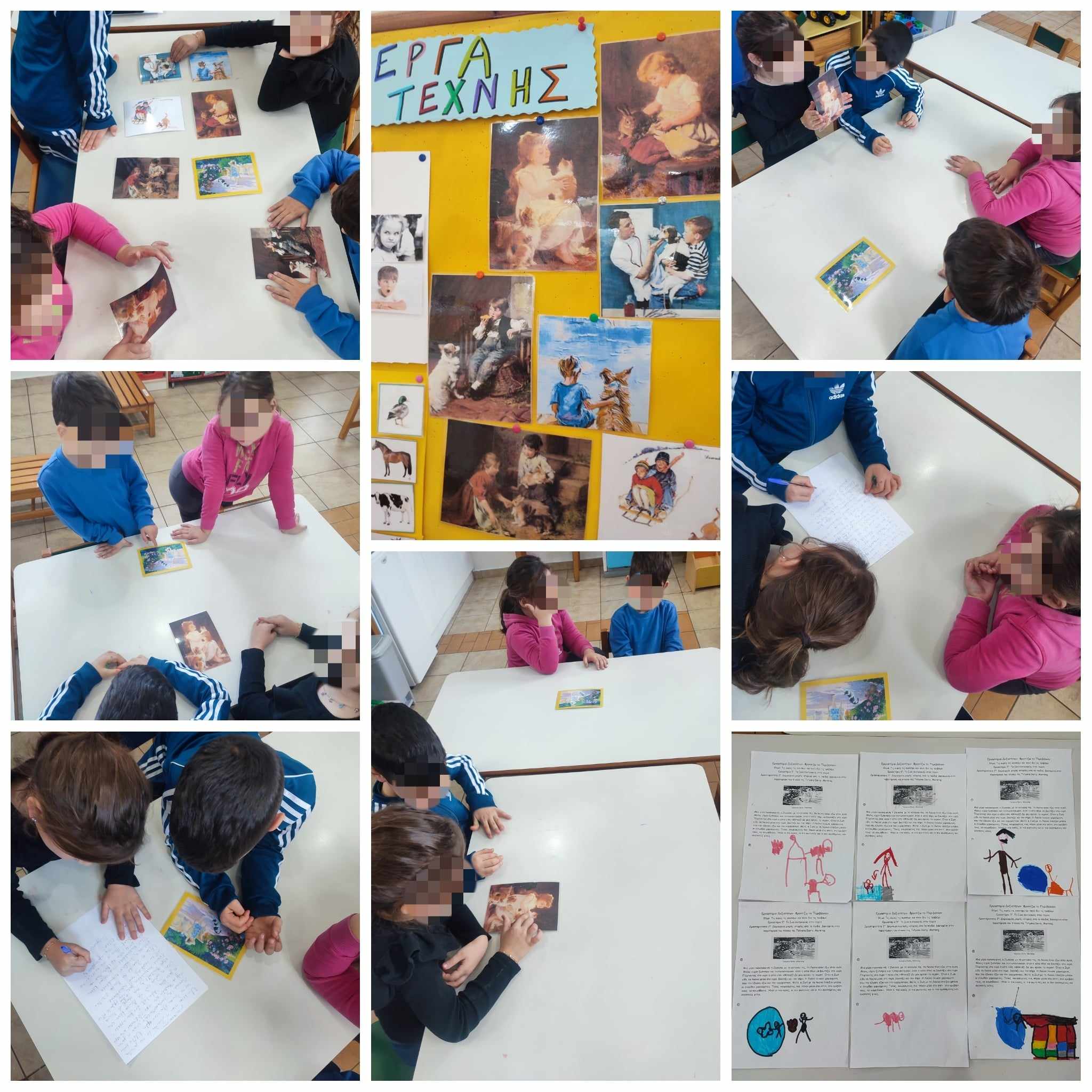 Επεξεργαστήκαμε πίνακες ζωγραφικής με θέμα τα ζώα. Τις παρατηρήσαμε, τις περιγράψαμε κι έπειτα χωριστήκαμε σε δύο ομάδες. Κάθε ομάδα, επέλεξε ένα πίνακα. Τα μέλη της ομάδας συζήτησαν για τον πίνακα και τον περιέγρψαν στα παιδιά της άλλης ομάδας. Στη συνέχεια, αποφασίσαμε όλοι μαζί τον αγαπημένο μας πίνακα και γράψαμε την πρώτη μας ιστορία!