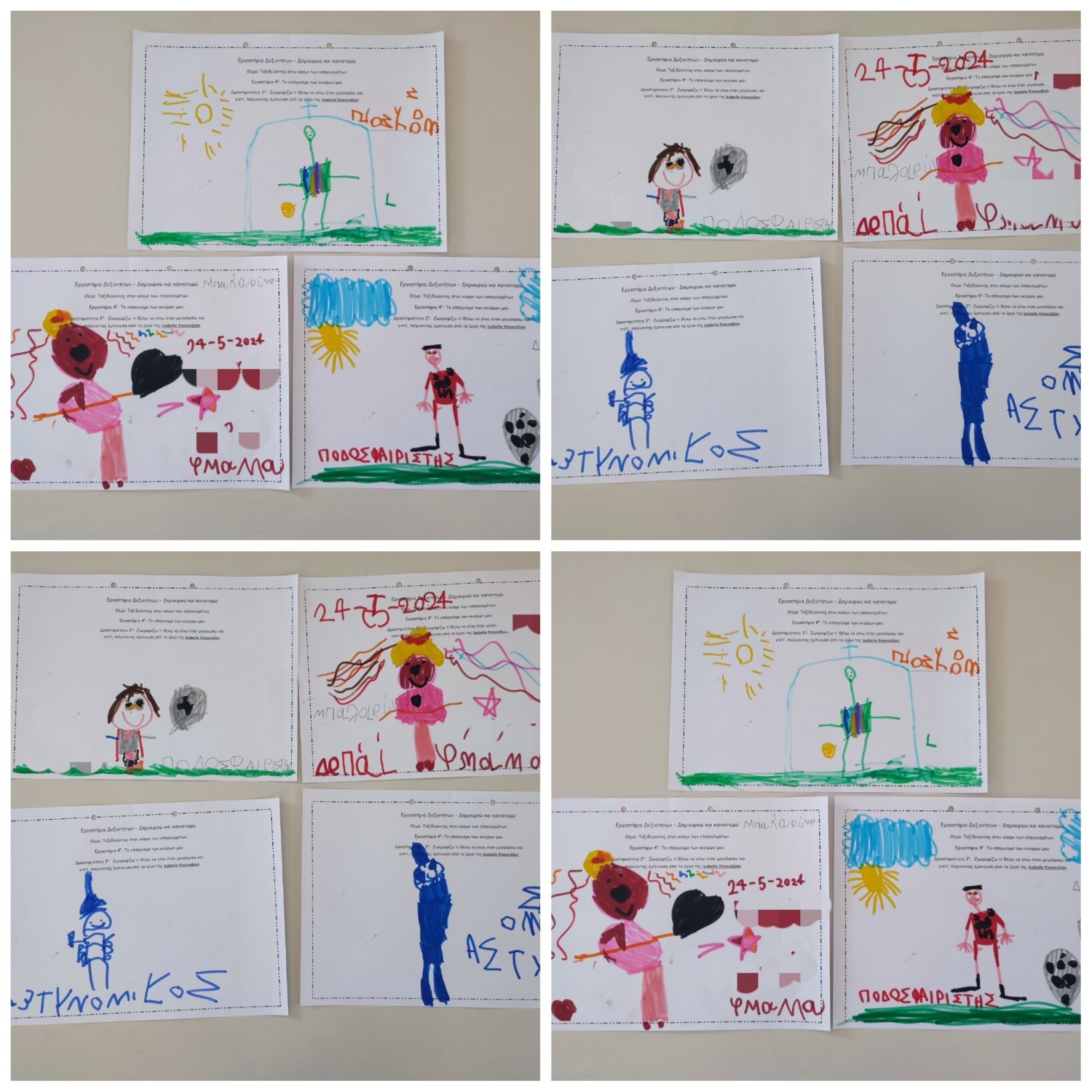 Ζωγραφίσαμε το επάγγελμα της μαμάς και του μπαμπά και με βάση τους γρίφους, τα παιδιά μαντέψανε το επάγγελμα και ζωγραφίσανε ένα εργαλείο απαραίτητο για το επάγγελμα.