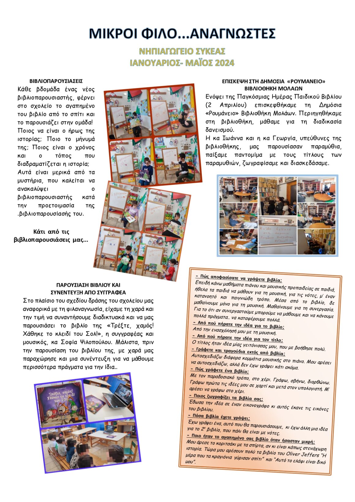 Ξεκινήσαμε και τις βιβλιοπαρουσιάσεις μας. Κάθε βδομάδα ένα παιδί ορίζεται ως βιβλιοπαρουσιαστής, φέρνει στο σχολείο το αγαπημένο του βιβλίο από το σπίτι και το παρουσιάζει στην ομάδα!