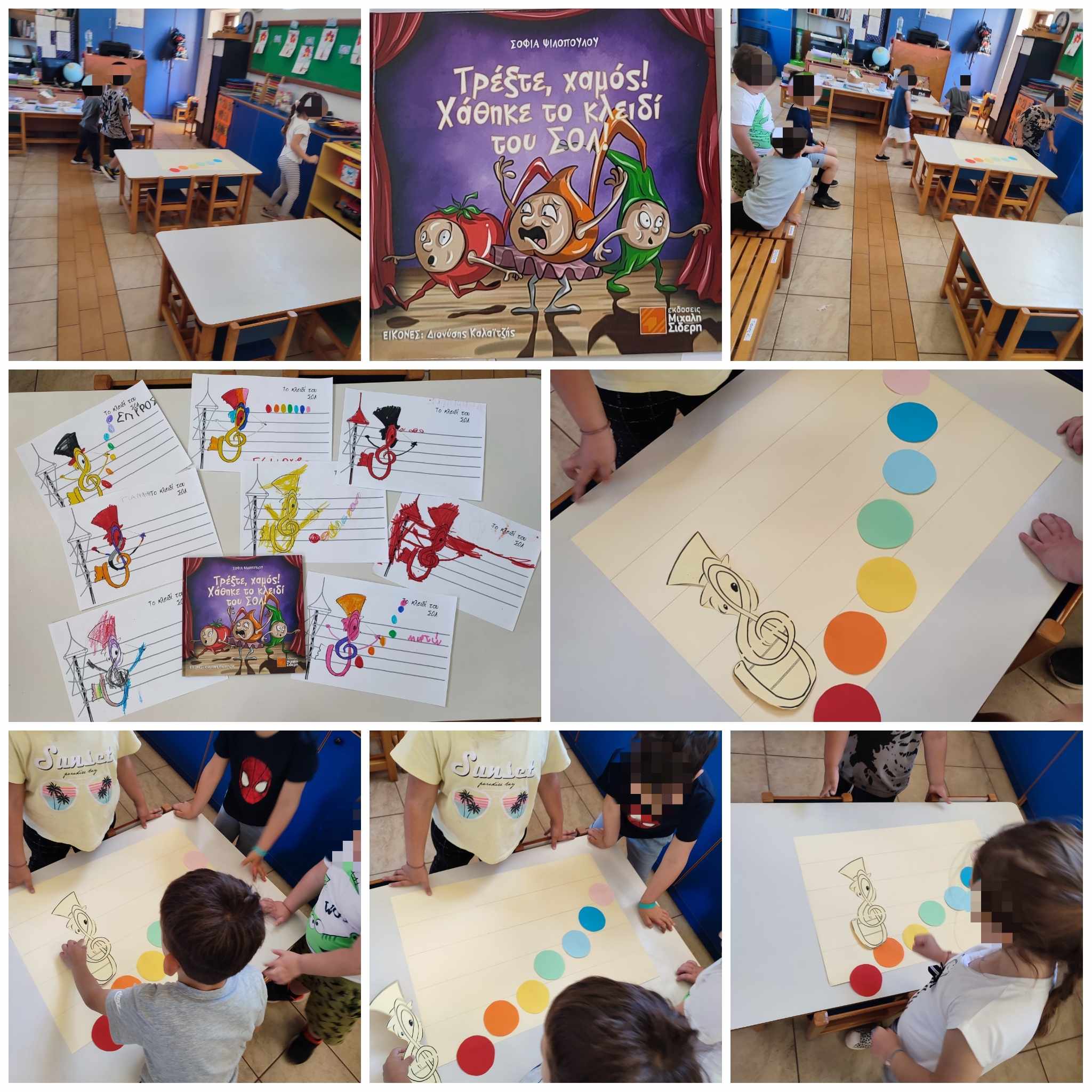Μετά την παρουσίαση, χάθηκε το κλειδί του Σολ της τάξης μας. Τα παιδιά, χωρισμένα σε ομάδες, προσπάθησαν να το βρουν και να το τοποθετήσουν στο αυτοσχέδιο πεντάγραμμό μας. Στη συνέχεια, συμπλήρωσαν τις νότες και το δικό τους κλειδί του Σολ σε φύλλο εργασίας.