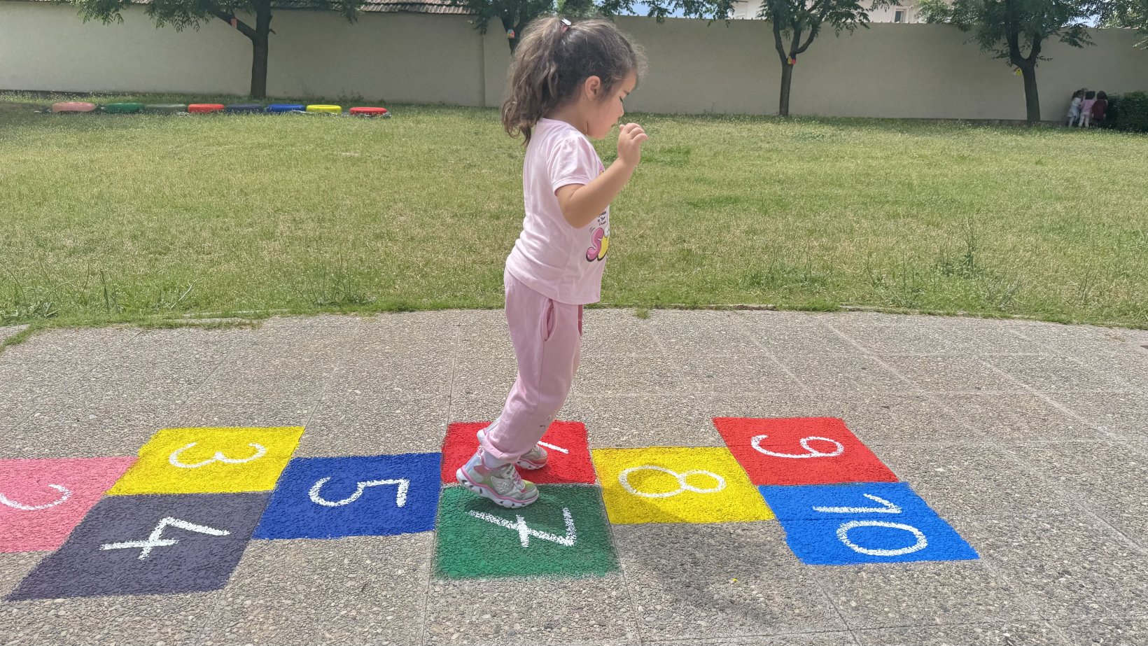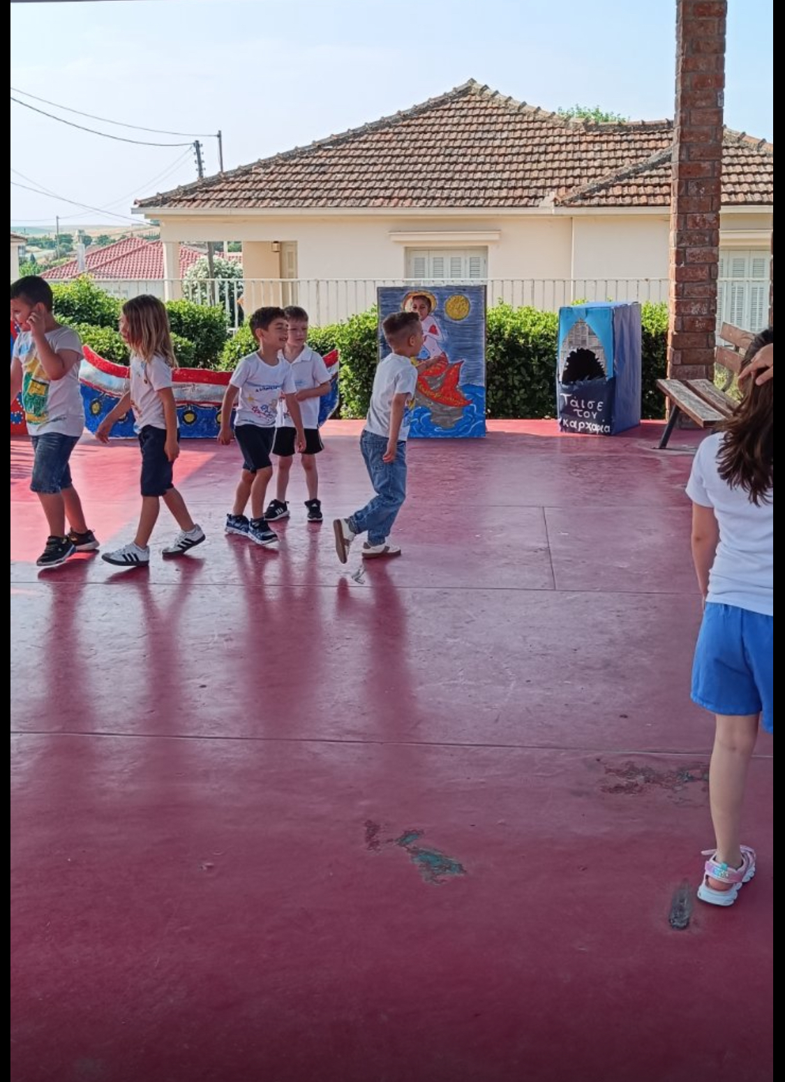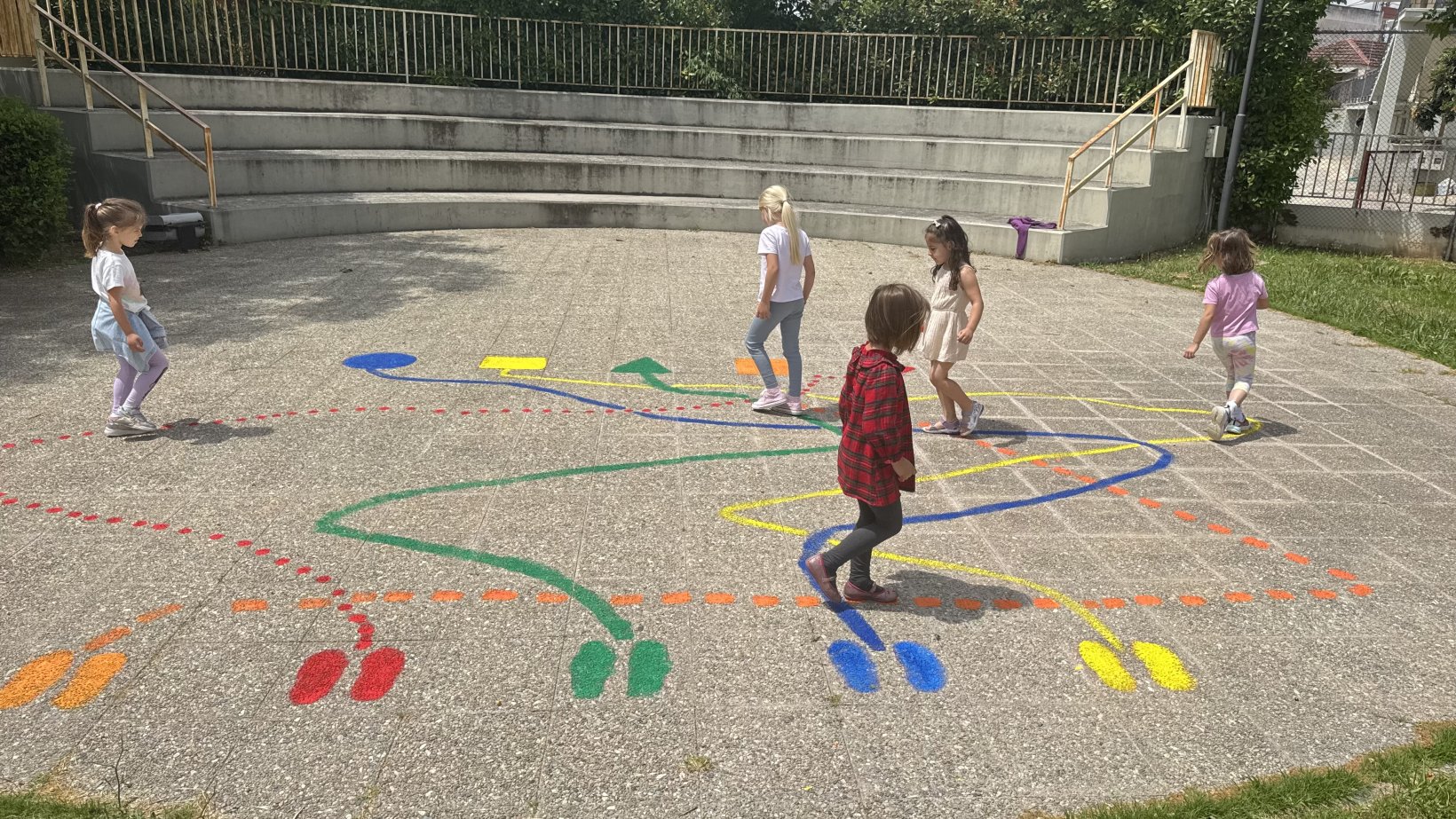 Αποφασίσαμε επίσης ότι θέλουμε πιο όμορφη την αυλή μας και έτσι ζωγραφίσαμε τα δάπεδα και έναν τοίχο .Αξιοποιήσαμε τα δάπεδα που διαθέτει η αυλή μας και ζωγραφίσαμε με την βοήθεια γονέων επιδαπέδια εκπαιδευτικά παιχνίδια. Με δαπάνη της Σχολικής Επιτροπής αγοράσαμε τα υλικά (πλαστικά χρώματα, πινέλα, ρολά) και ζωγραφίσαμε με τη βοήθεια γονέων επιδαπέδια παιχνίδια : 1.Διαδρομές στο χώρο, με διάφορα είδη γραμμών που καταλήγουν σε διαφορετικό σχήμα η καθεμία. 2.Την κάμπια της αλφαβήτας .3.Κουτσό με αρίθμηση 1-10. Επίσης ζωγραφίσαμε μια ωραία παράσταση σε ένα τοίχο του κτηρίου με ένα πολύ τρυφερό μήνυμα. “Σπείρε αγάπη κι ας μη θερίσεις, έτσι για να μοσχοβολάει ο τόπος”.
