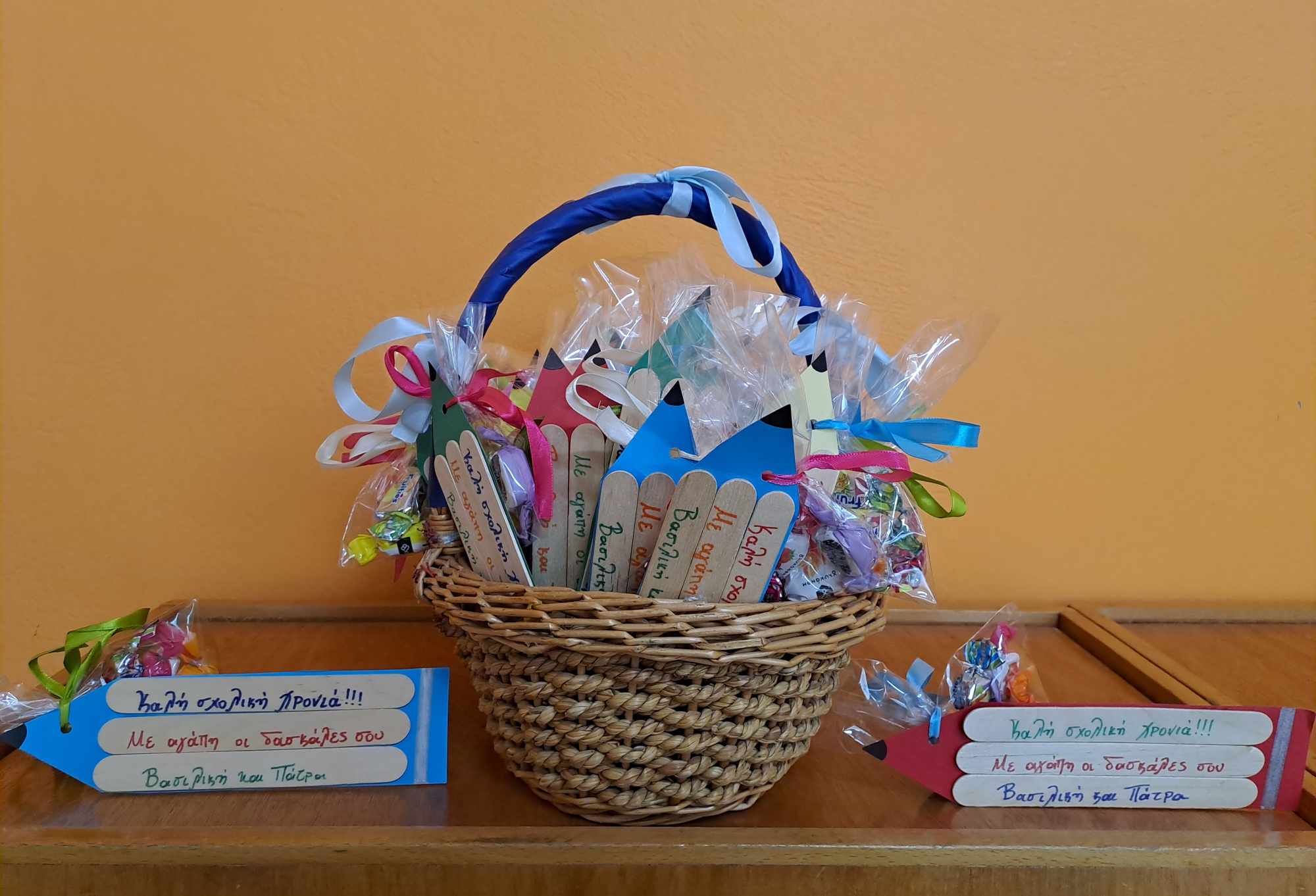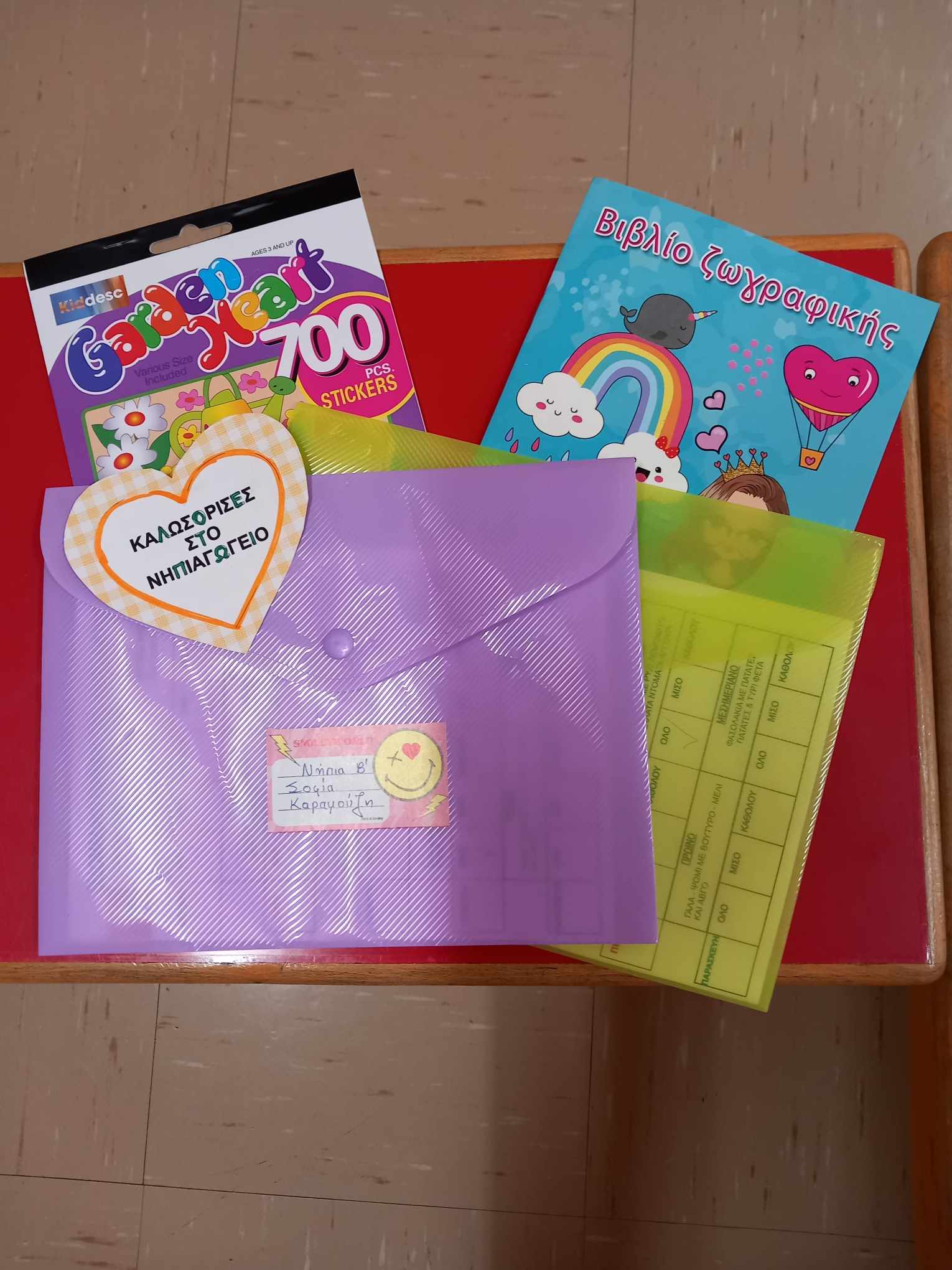 Αγαπημένοι μας σουπερ ήρωες σας καλωσορίζουμε στην καινούργια σας τάξη με ένα μικρό δωράκι. Κάθε σούπερ ήρωας έχει τις μαγικές του δυνάμεις που τις χρησιμοποιεί για να κάνει πάντα το κάλο. Θα πάρετε λοιπόν ένα φάκελο με κουμπί που θα βάζετε μέσα το χαρτάκι που θα βλέπουν οι γονείς σας τί έχετε φάει κάθε μέρα και θα βρίσκεται πάντα στη τσαντούλα σας, αφού οι σούπερ ήρωες πρέπει να τρώνε το φαγητό τους για να έχουν δυνατά χεράκια για μεγάλες και ζεστές αγκαλιές, ένα μπλοκ ζωγραφικής με κηρομπογιές για να ζωγραφίζετε τα όνειρα και τα σχεδία σας, μιας και ένας καλός σουπερ ήρωας έχει μυαλό για να βρίσκει λύση σε κάθε πρόβλημα, ένα μπαλονάκι, μια σφυριχτρούλα και αυτοκολλητάκια γιατί το παιχνίδι και η χαρά δεν λείπει ποτέ από την ζωή του σούπερ ήρωα και μια καραμελίτσα για ένα γλυκό σουπερ καλωσόρισμα από τις δασκάλες σας.