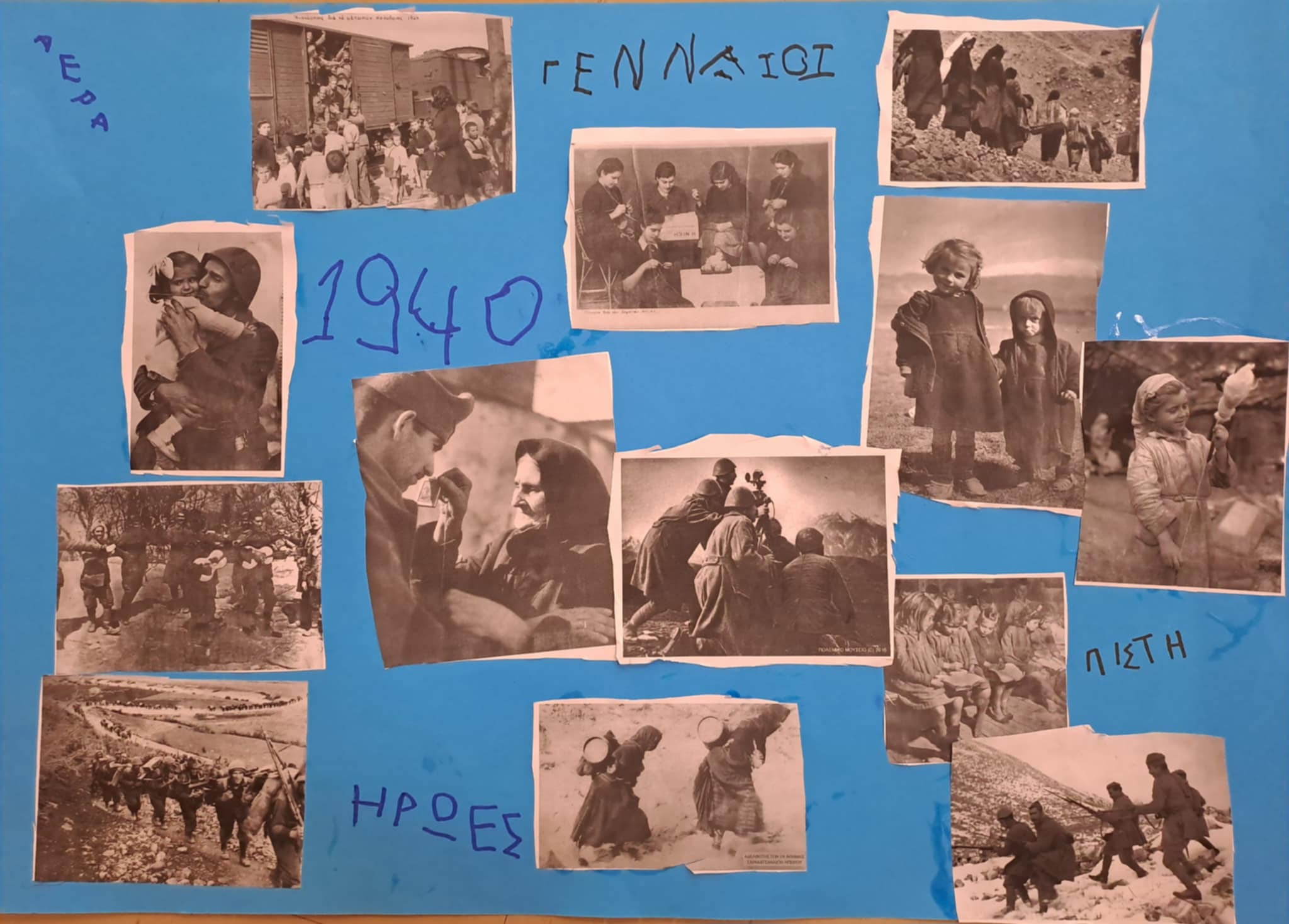 Ζητήσαμε από τους γονείς των παιδιών του τμήματος να βρούνε εικόνες από τον πόλεμο του 1940 . Αφού τις συγκεντρώσαμε τα παιδιά της έκοψαν και δημιούργησαν ένα κολλάζ με φωτογραφικά στιγμιότυπα από τον πόλεμο του 1940.