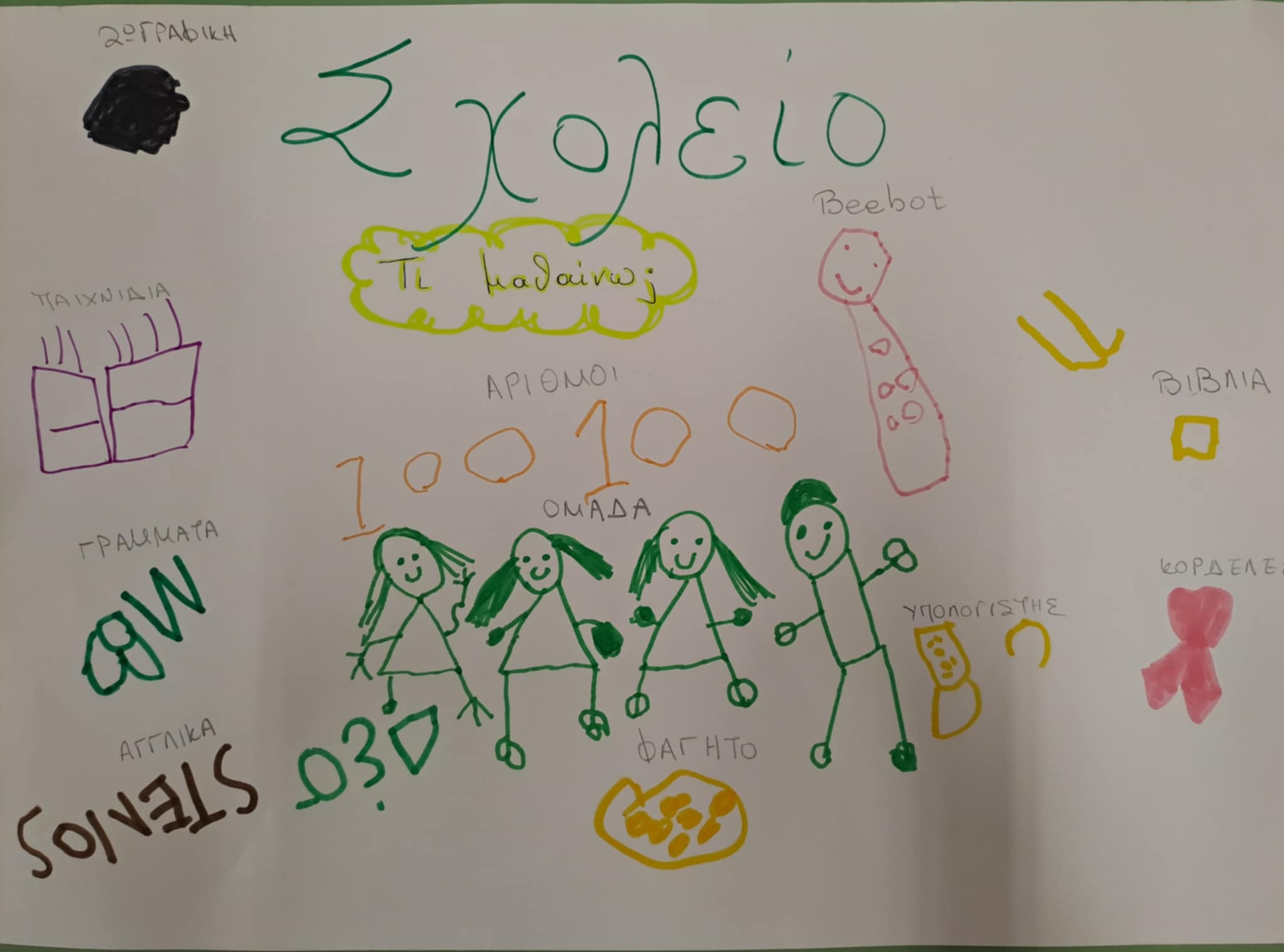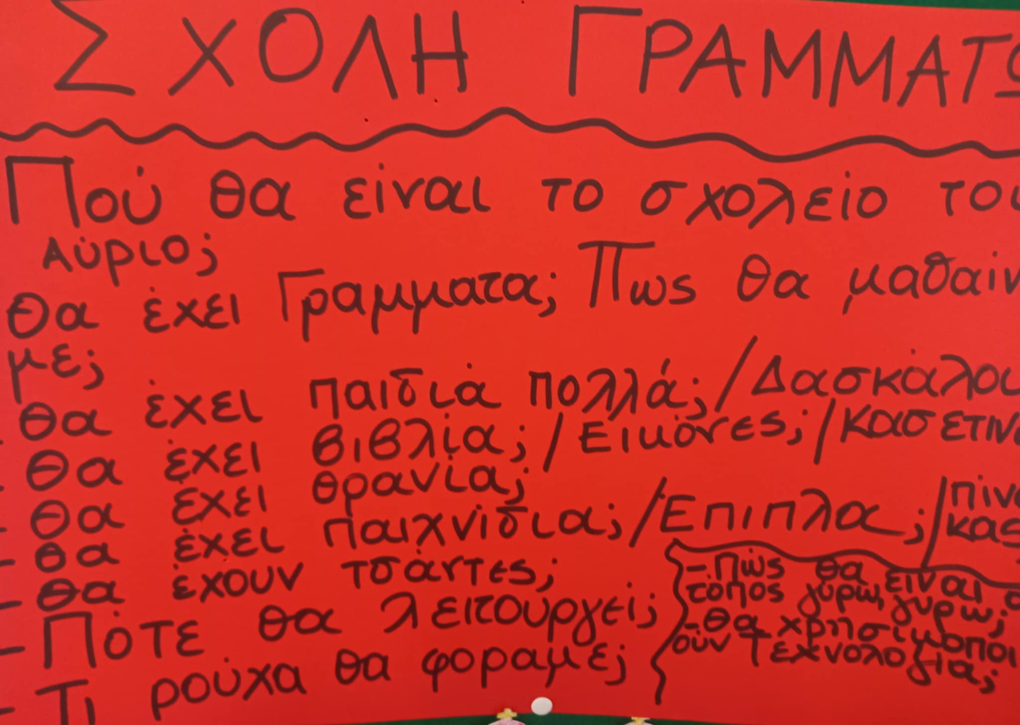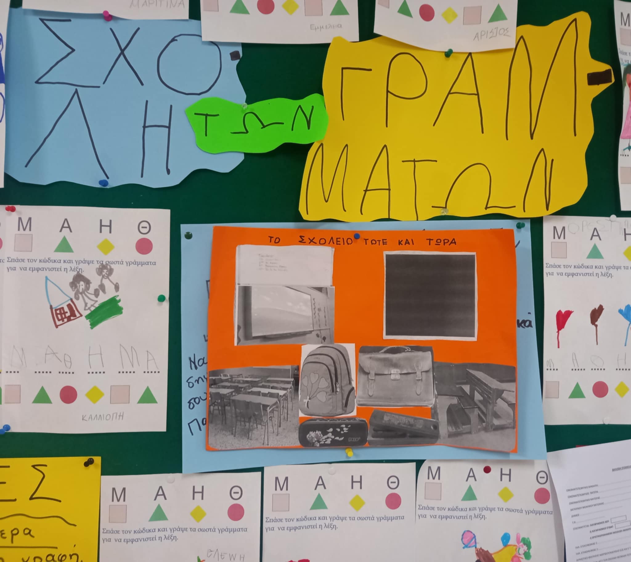 Δημιουργήσαμε την Σχολή Γραμμάτων. Τα παιδιά έθεσαν τα δικά τους ερωτήματα και ανακάλυψαν μέσα απο την παρατήρηση και παιχνίδια που έγιναν στην τάξη τις διαφορές του σχολείου του τότε και του τώρα! Στην συνέχεια ζωγράφισαν όπως φαντάζονται το σχολείο του μέλλοντος!!!!