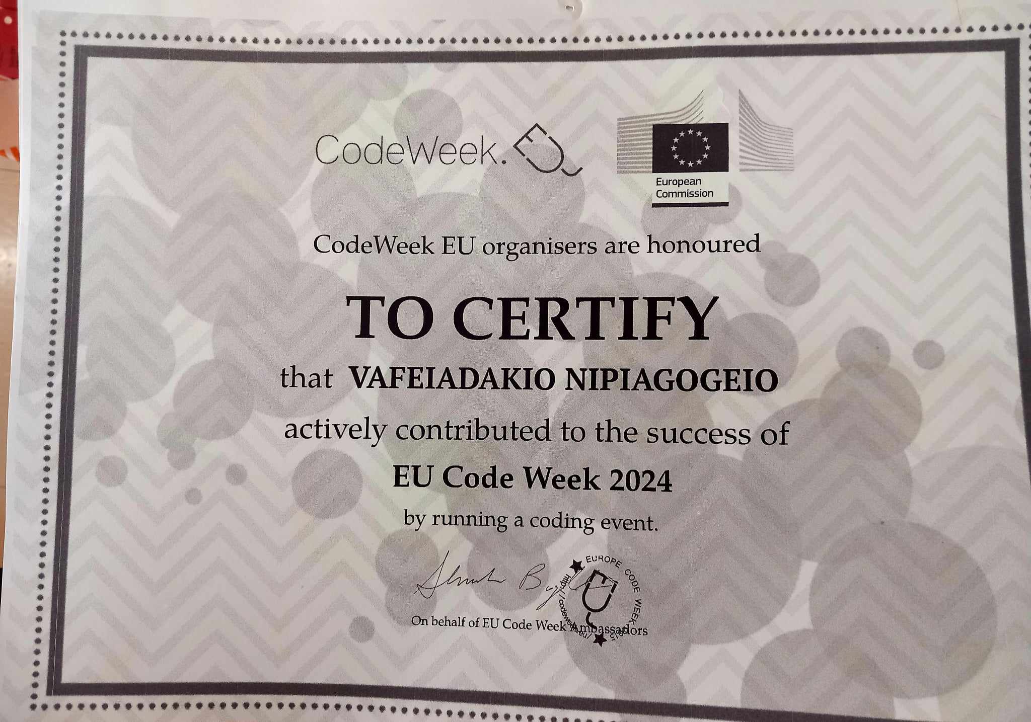 H Ευρωπαϊκή Εβδομάδα Προγραμματισμού, αποτελεί μια πρωτοβουλία σε επίπεδο πολιτών, με την υποστήριξη της Ευρωπαϊκής Επιτροπής, η οποία στοχεύει στην ενσωμάτωση της κωδικοποίησης ,της υπολογιστικής σκέψης και του ψηφιακού γραμματισμού για όλους, με διασκεδαστικό και ενεργό τρόπο χάρη στη διοργάνωση εκδηλώσεων σε όλον τον κόσμο από εκπαιδευτικούς και λάτρεις του προγραμματισμού.