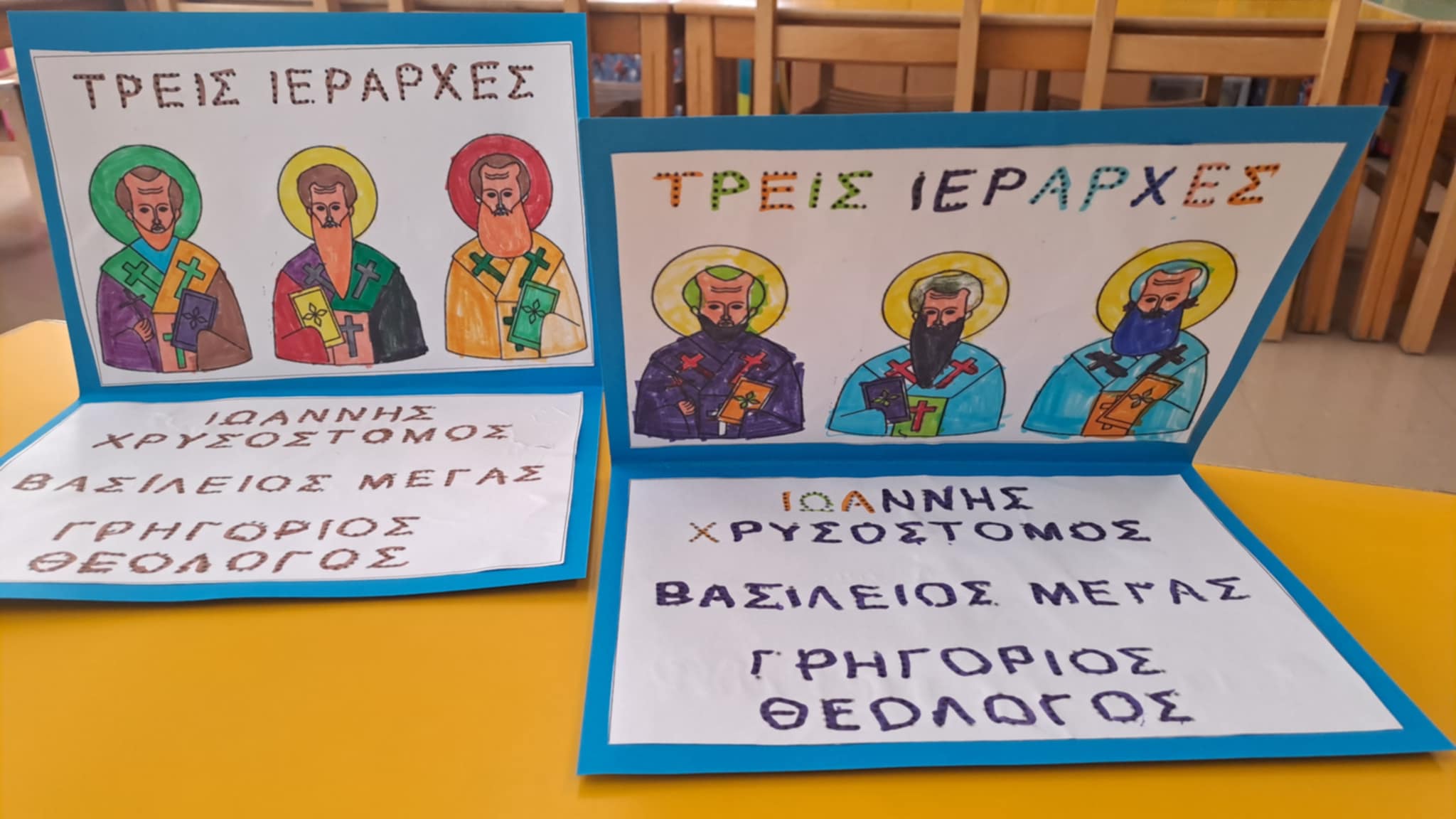 Στο Νηπιαγωγείο μας, για να τους τιμήσουμε, μάθαμε τα ονόματά τους, αναφερθήκαμε στη ζωή τους, στην προσφορά τους στα γράμματα, παρακολουθήσαμε σχετικό βιντεάκι στον διαδραστικό πίνακα και μάθαμε μια προσευχούλα για τους 3 Ιεράρχες