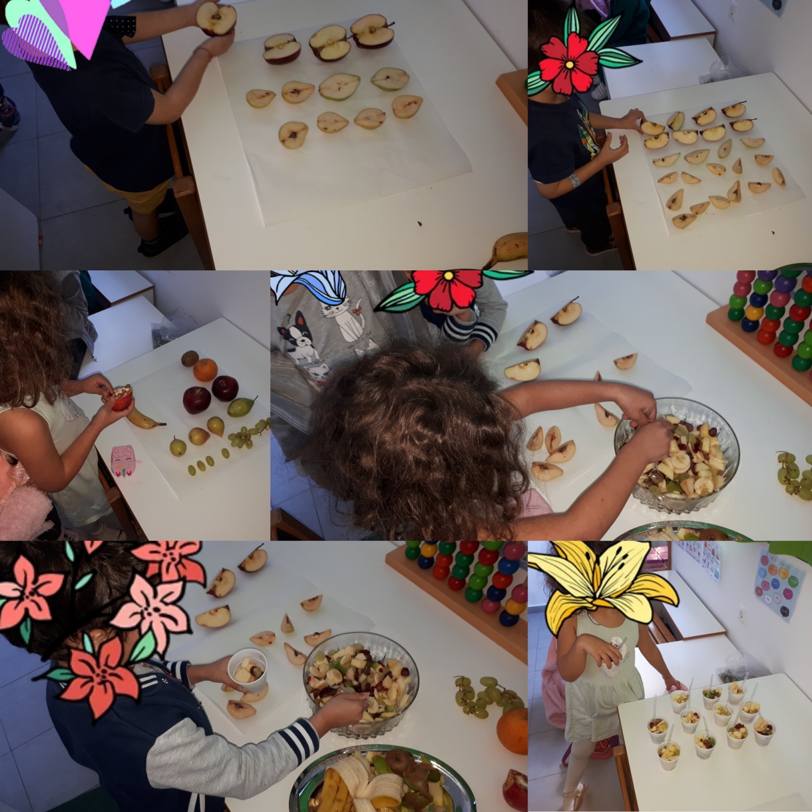 Φέραμε και φθινοπωρινά φρούτα από το σπίτι, τα παρατηρήσαμε ως προς το χρώμα και το σχήμα, κάναμε μαθηματικά με αυτά (ολόκληρο, μισό, τέταρτο) παρατηρήσαμε τα κουκούτσια τους και κάναμε φρουτοσαλάτα!