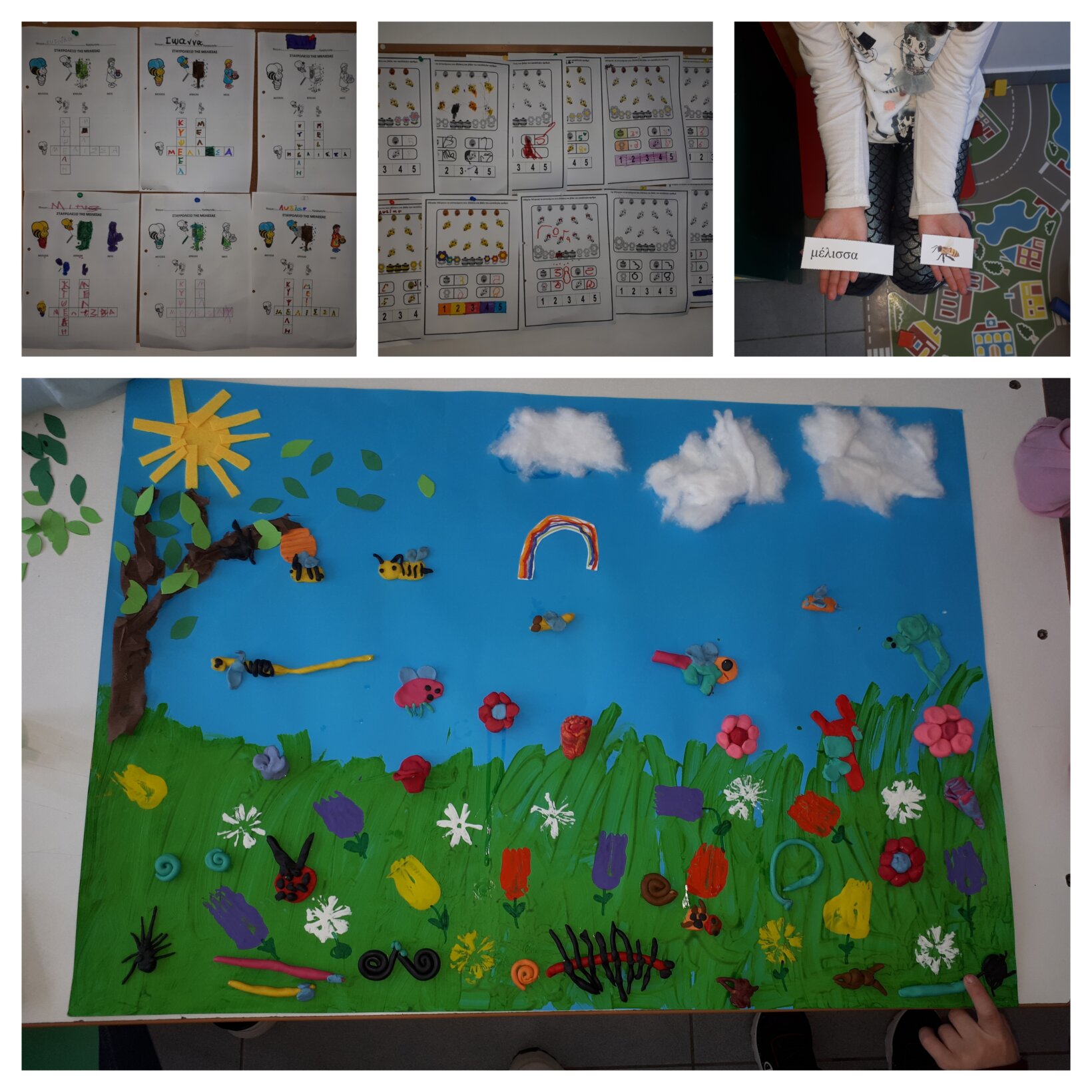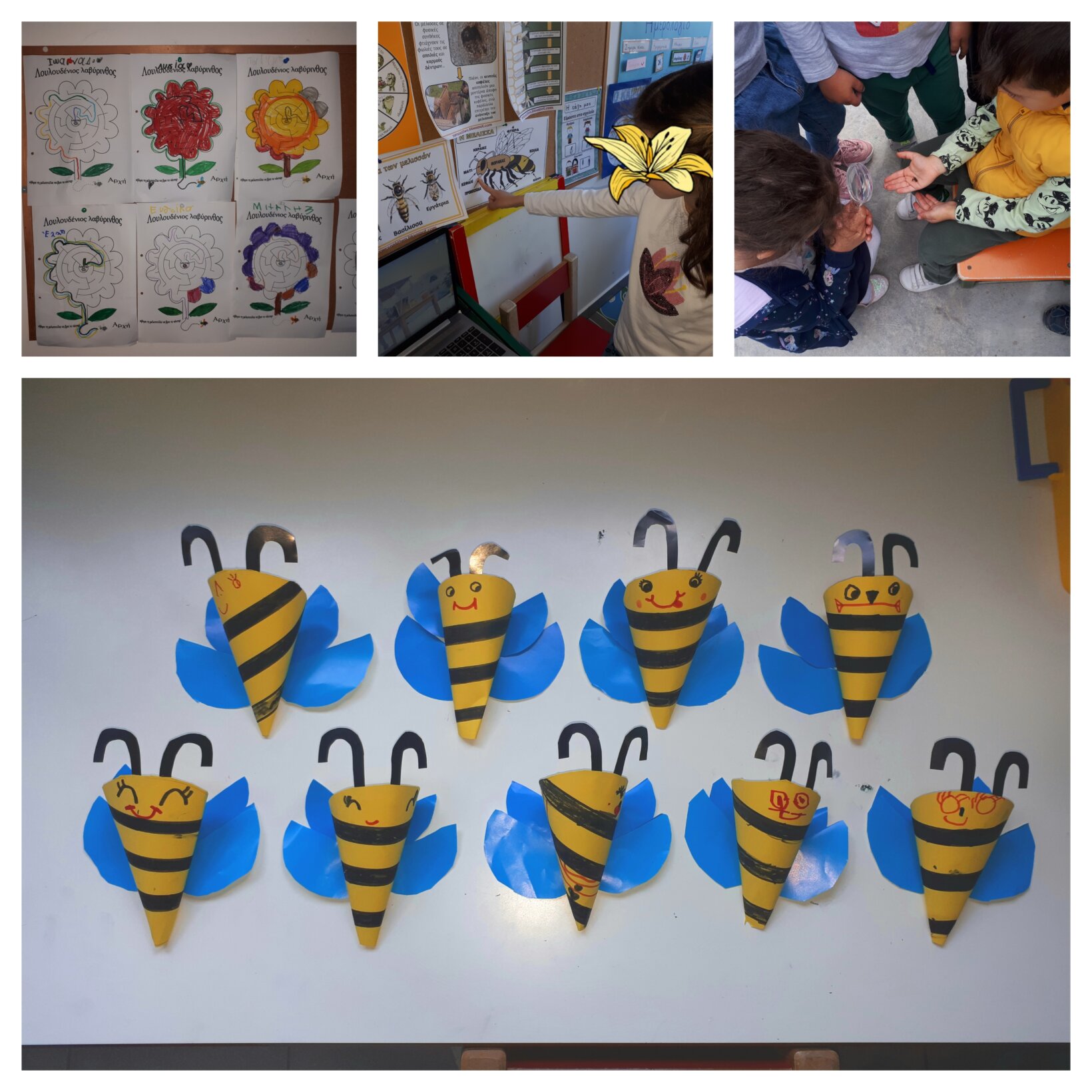 Παρακολουθήσαμε στην τάξη σχετικά με τη μέλισσα βιντεάκια και την οργανωμένη κοινωνία στην οποία ζει, παίξαμε μαθηματικά παιχνίδια και θεατρικό παιχνίδι και κάναμε σχετικά φύλλα εργασίας και κατασκευή.
