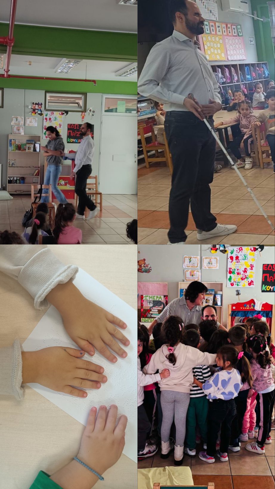 Είχαμε τη χαρά να φιλοξενήσουμε στο σχολείο μας τον κύριο Βαγγέλη, ο οποίος είναι τυφλός και μας μίλησε για την ιδιαιτερότητά του. Μέσα από την αφήγησή του μας έδειξε πως, παρά τις δυσκολίες, μπορούμε να πετύχουμε πολλά με δύναμη, υπομονή και θέληση. Τα λόγια του μας ενέπνευσαν να βλέπουμε τη ζωή με περισσότερη αισιοδοξία και σεβασμό στη διαφορετικότητα.