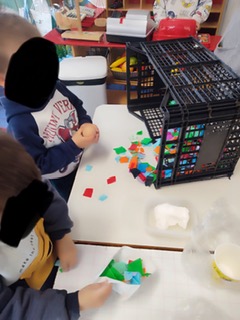 Μαντεύαμε με την αφή αντικείμενα από μία ¨τσάντα-έκπληξη¨ και τα τοποθετούσαμε στη σωστή γωνιά.