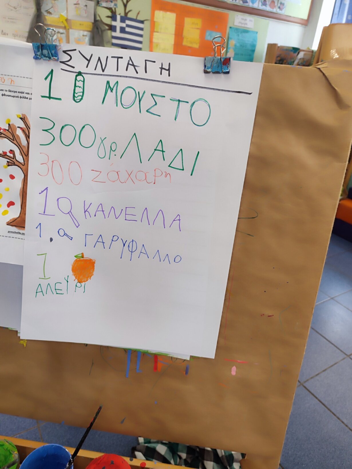 Στο πλαίσιο του Σχεδίου Δράσης “Μετάβαση από το Νηπιαγωγείο στο Δημοτικό” στις αρχές του σχολικού έτους και συγκεκριμένα τον Οκτώβριο δουλεύοντας το project με θέμα “Τρύγος”, οι μικροί μαθητές σκέφτηκαν να φτιάξουν μουστοκούλουρα, τα οποία θα προσφέρουν στους μαθητές και δασκάλους του Δημοτικού Βατώντα ως καλωσόρισμα. Γράψαμε τη συνταγή και αναλάβαμε δράση!!! Στη συνέχεια επισκεφθήκαμε το Δημοτικό όπου τους προσφέραμε το κέρασμα, απολαύστε μας!!!
