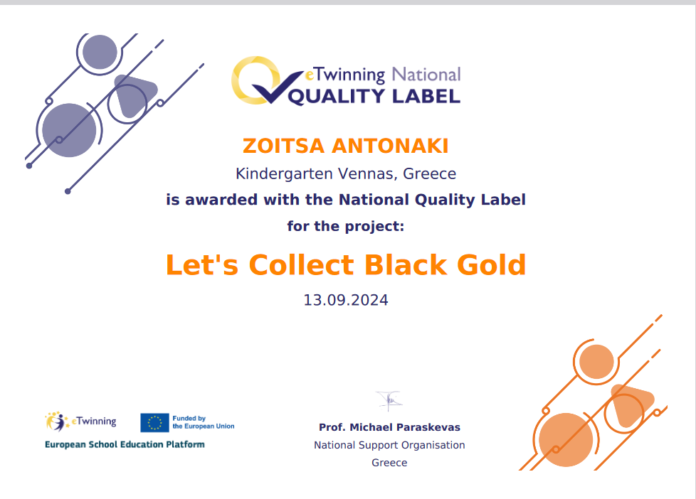 ΕΘΝΙΚΗ ΕΤΙΚΈΤΑ ΠΟΙΟΤΗΤΑΣ ΓΙΑ ΤΟ ΠΡΟΓΡΑΜΜΑ “LET’S COLLECT BLACK GOLD” 7 Νοεμβρίου 202424 Απριλίου 2025 ΝΗΠΙΑΓΩΓΕΙΟ ΒΕΝΝΑΣ