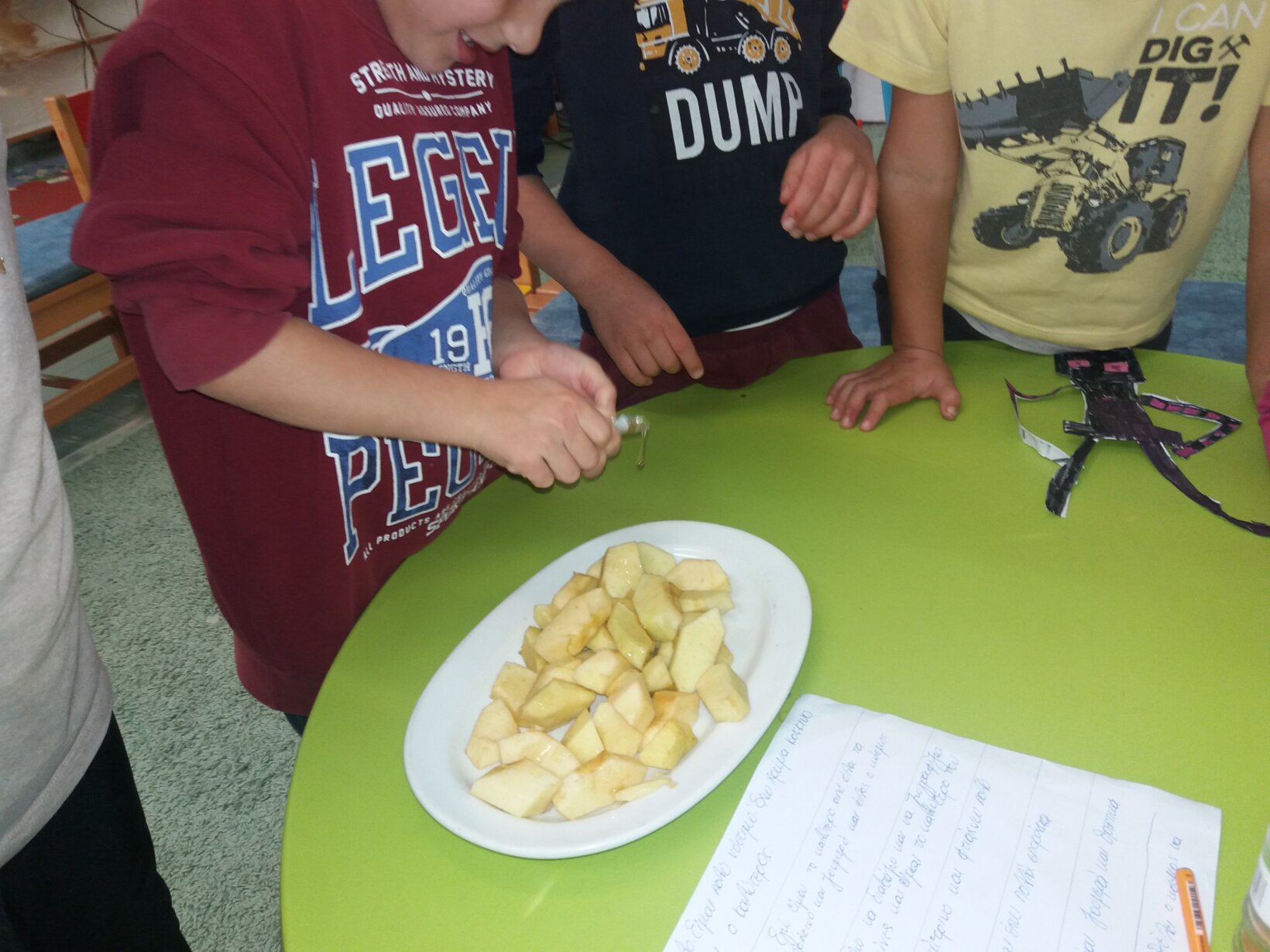 Ήρθε η ώρα να δοκιμάσουμε τις μαγειρικές μας δυνατότητες! Και τι καλύτερο να χρησιμοποιήσουμε από το βασιλιά των φθινοπωρινών φρούτων το μήλο. Ώρα λοιπόν να φτιάξουμε κέικ μήλου! Αφού συγκεντρώσαμε τα υλικά διαβάσαμε τη συνταγή και αρχίσαμε να μετράμε και να ανακατεύουμε τα υλικά. Όταν ετοιμάσαμε τη ζύμη γεμίσαμε ατομικά φορμάκια κέικ και στη συνέχεια η δασκάλα μας τα έβαλε στο φούρνο. Τη συνέχεια την μαντεύετε;