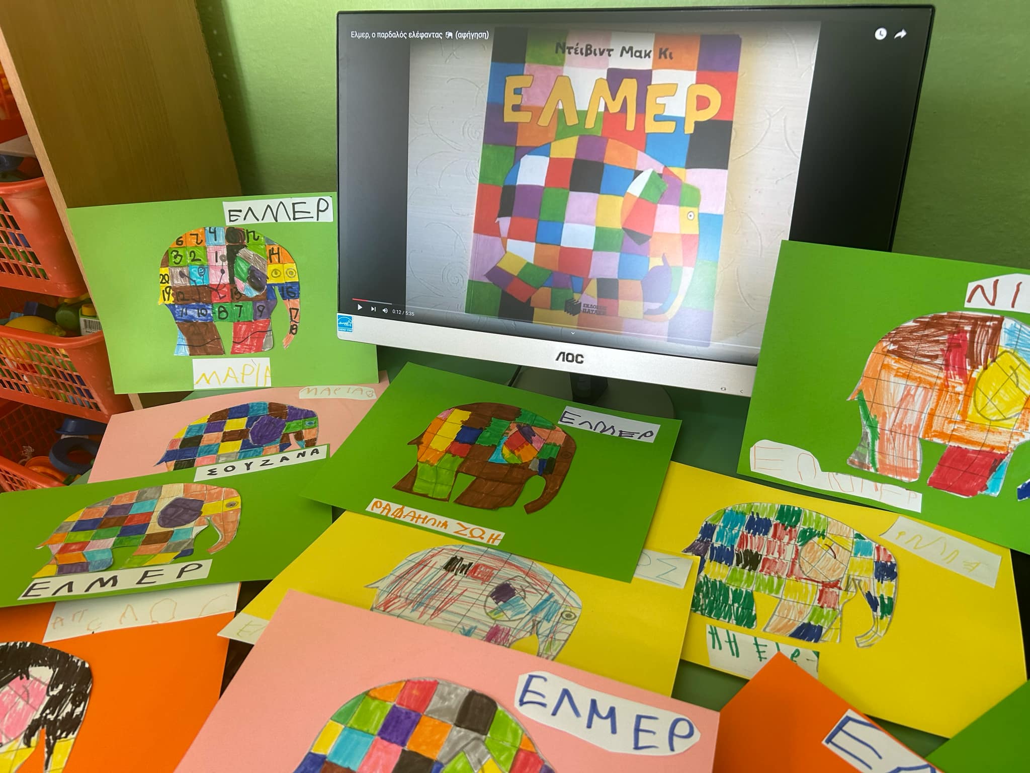 Στο εργαστήριο αυτό, διαβάσαμε ξανά ένα πολύ αγαπημένο μας παραμύθι, τον Έλμερ, τον παρδαλό ελέφαντα.