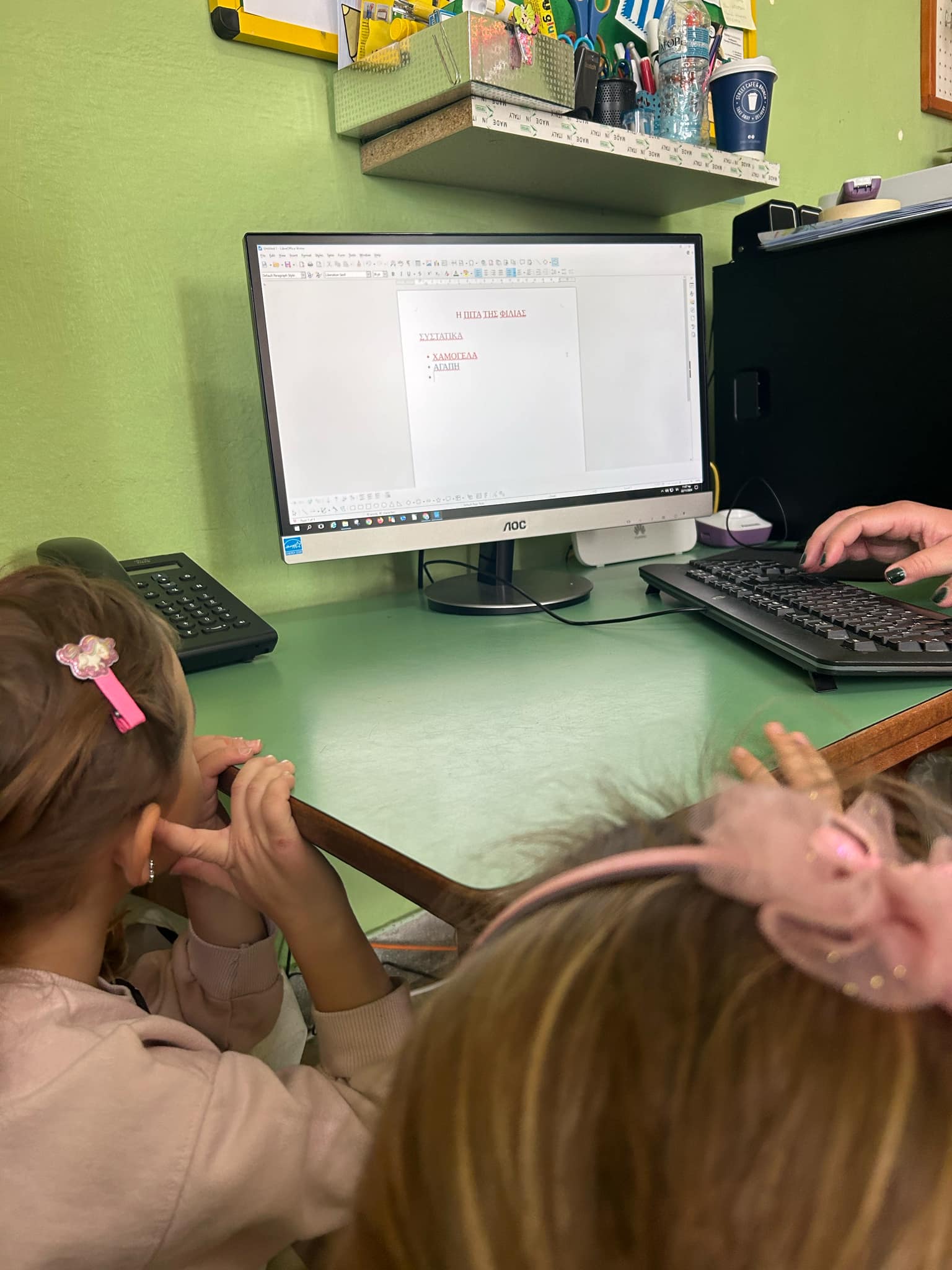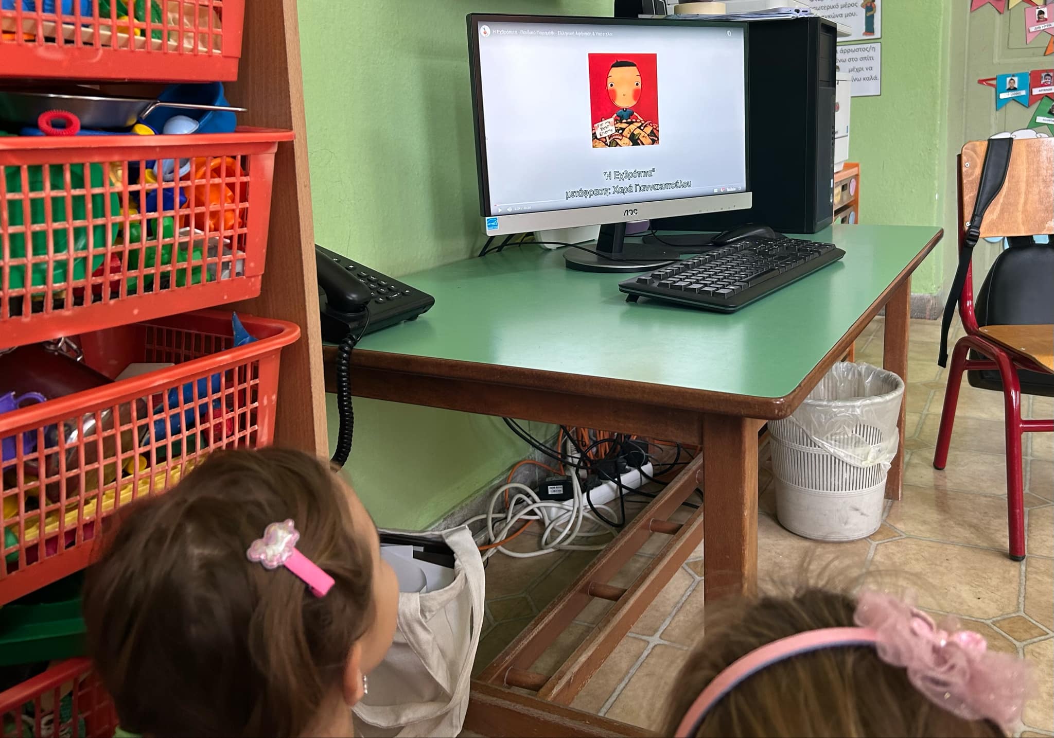 Στη συνέχεια, παρακολουθήσαμε όλοι μαζί στον υπολογιστή της τάξης μας, το παραμύθι «Η εχθρόπιτα» και αφού συζητήσαμε σχετικά, προσπαθήσαμε να βρούμε λύσεις για το πώς να διαχειριζόμαστε μια κατάσταση διένεξης. Προτάθηκαν πολλές λύσεις, κυρίως οι αναπνοές (μυρίζω λουλούδι – σβήνω κερί), το μέτρημα μέχρι το δέκα, οι βόλτες, η μουσική, και φυσικά το μοίρασμα σε έναν ενήλικα.
