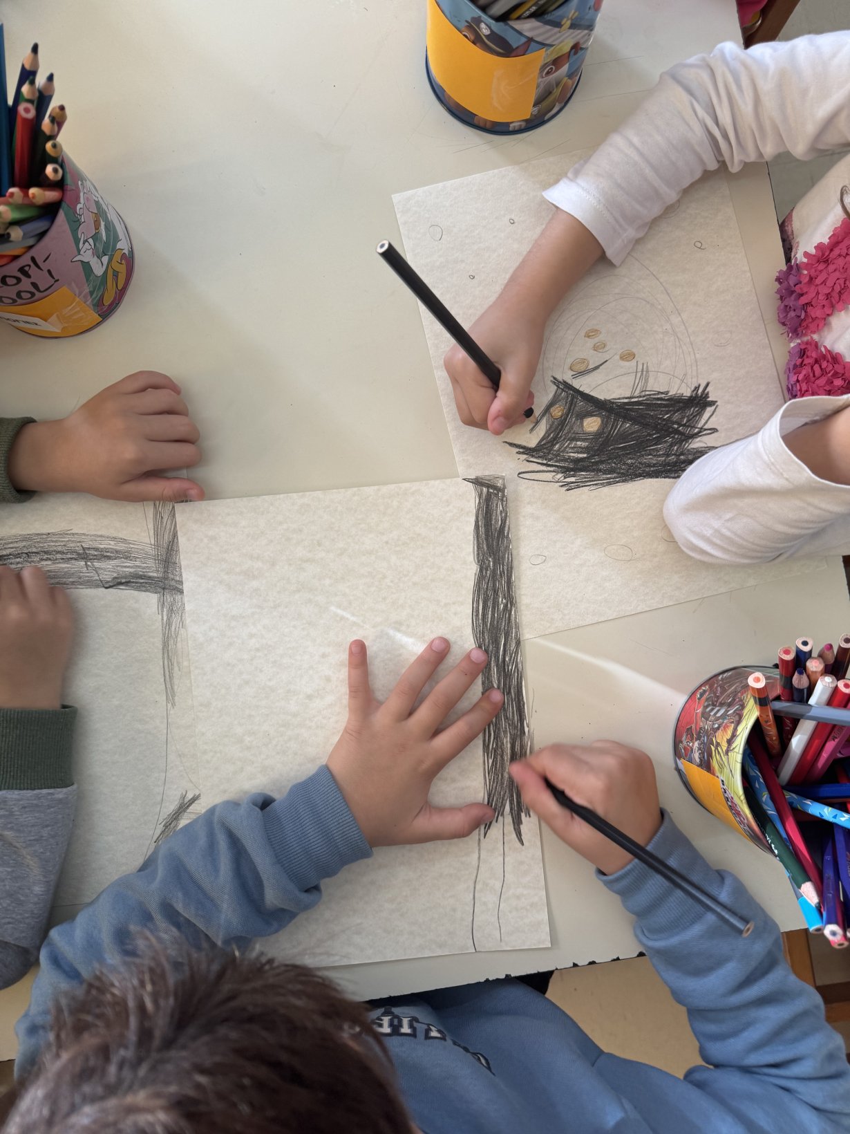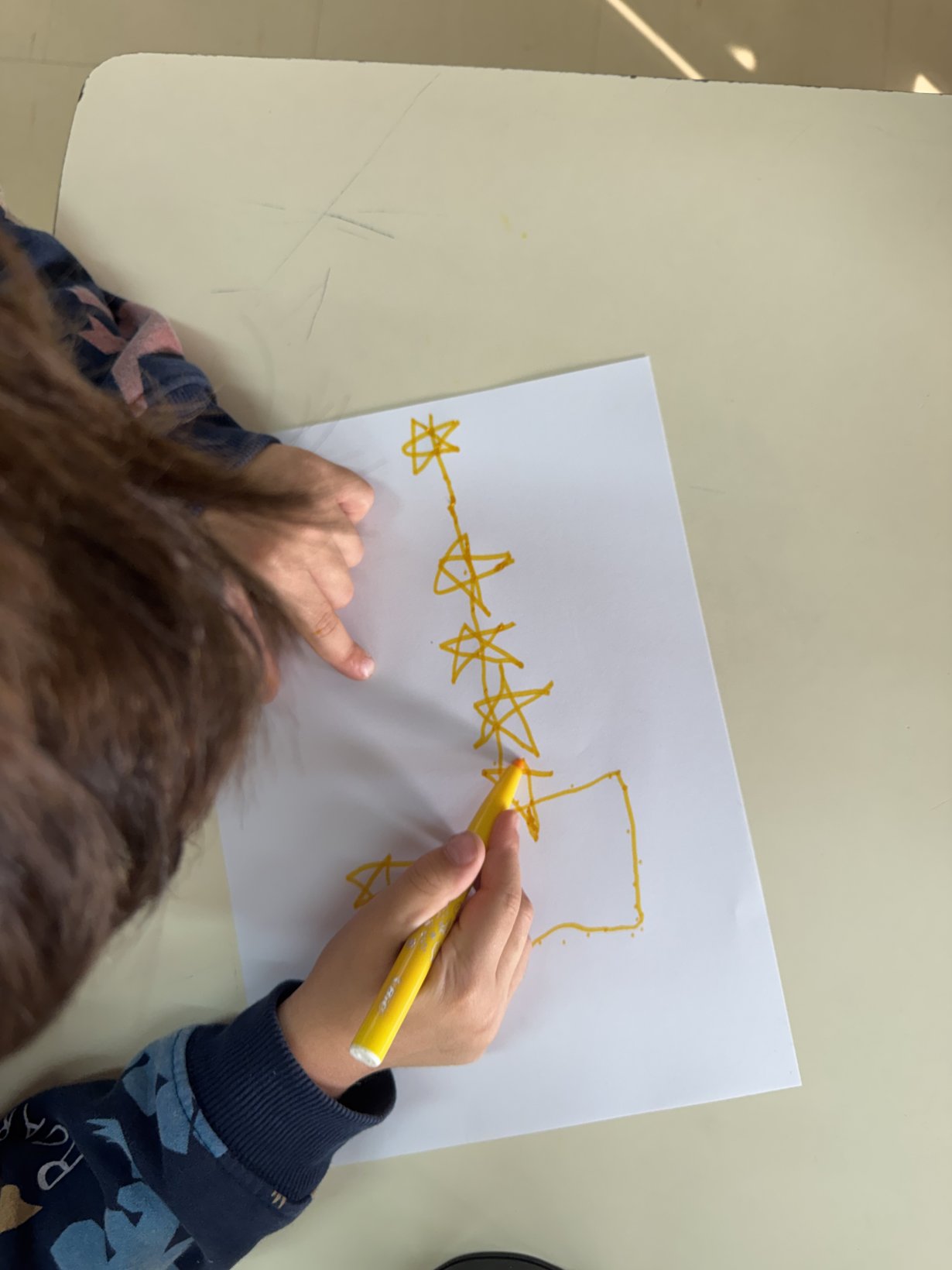 Στη συνέχεια ξεκινήσαμε με την ανακάλυψη της Μεγάλης Άρκτου. Τα παιδιά την παρατήρησαν, συζήτησαν για τη θέση της στον ουρανό και προσπάθησαν να την αποτυπώσουν στο χαρτί. Με αυτόν τον τρόπο συνέδεσαν την παρατήρηση των αστερισμών με τη δημιουργική έκφραση, συνεχίζοντας το ταξίδι τους στον έναστρο ουρανό με φαντασία και χρώματα.
