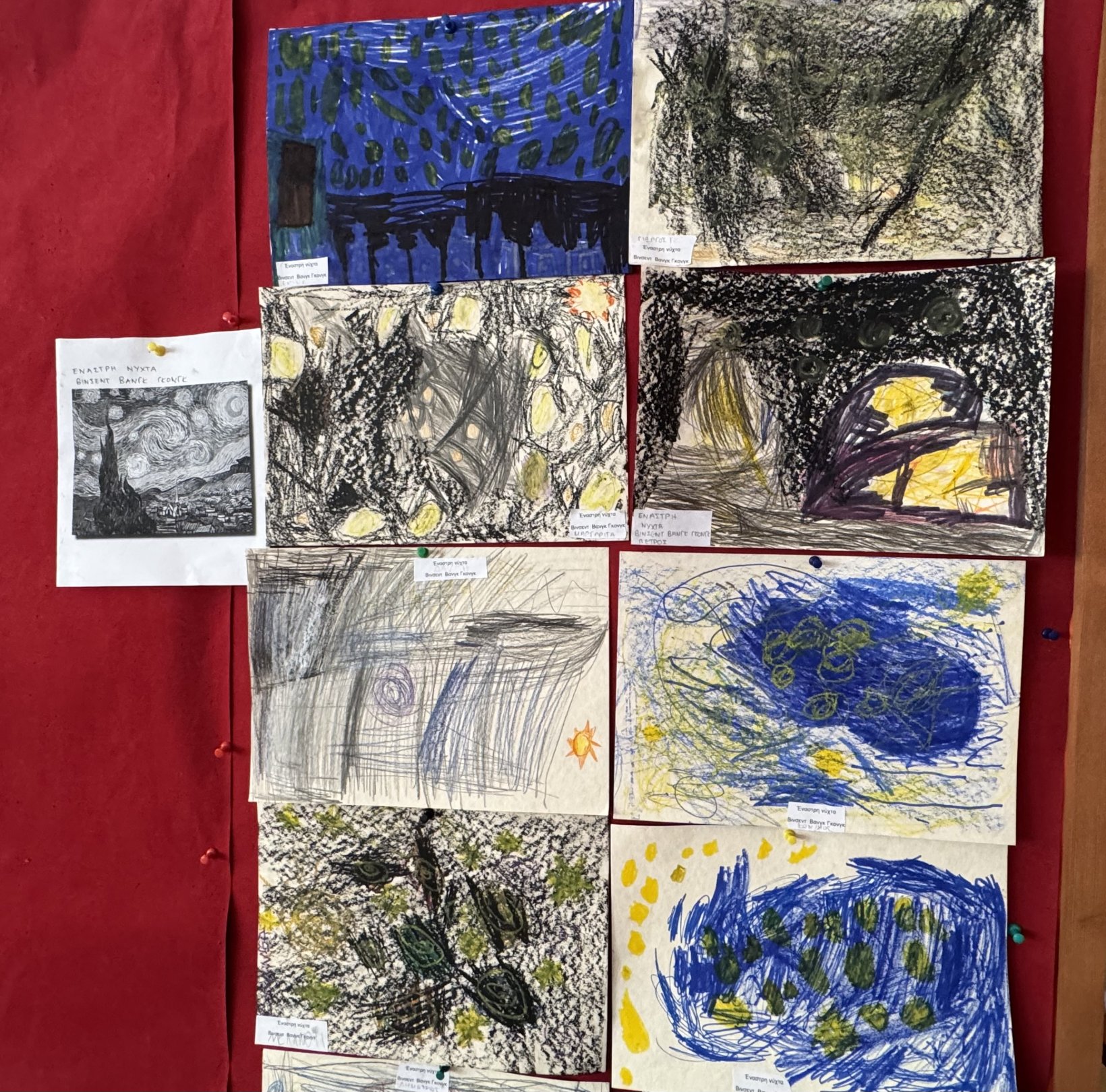 Η αφορμή για την συγκεκριμένη ενότητα ήταν ένα παραμύθι με τίτλο «Πολικός Αστέρας» και η περιέργεια των παιδιών να μάθουν τι είναι ο Πολικός Αστέρας και πώς φωτίζει τον ουρανό. Ανακάλυψαν τους αστερισμούς και το διάστημα ,ανακαλύπτοντας πως τα φωτεινά αστέρια σχηματίζουν διάφορα σχήματα .Τα παιδιά ζωγράφισαν τον δικό τους έναστρο ουρανό και, εμπνευσμένα από την «Έναστρη Νύχτα» του Βαν Γκογκ, δημιούργησαν τον ουρανό όπως θα τον έβλεπαν αυτά, παίζοντας με φαντασία και χρώματα.