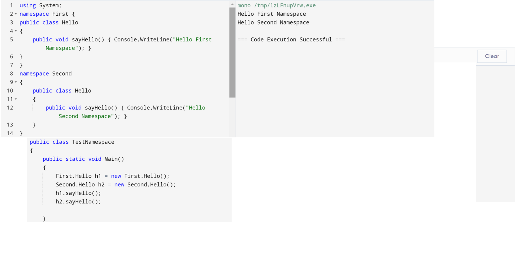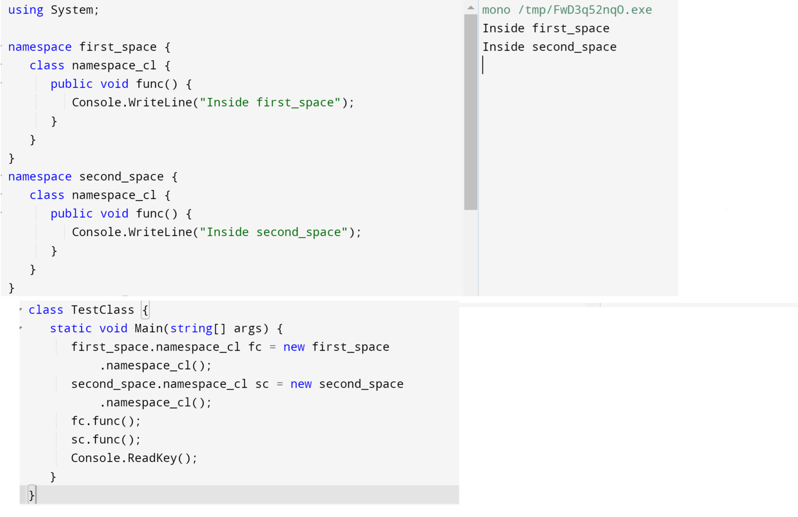 C# programs are organized using namespaces. Namespaces are used both as an “internal” organization system for a program, and as an “external” organization system—a way of presenting program elements that are exposed to other programs. Using directives (§14.5) are provided to facilitate the use of namespaces.