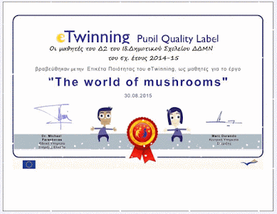 Με πολλή χαρά ανακοινώνω ότι μετά τον αγιασμό, βραβεύτηκε η τάξη μας (Δ2 2014-15) για το ευρωπαϊκό έργο του eTwinning“The World of Mushrooms”. Για το έργο αυτό οι μαθητές εργάστηκαν όλη την περσινή χρονιά σε συνεργασία με άλλα 10 σχολεία από Ελλάδα και Ευρώπη.