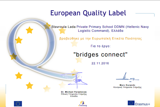 Τα δύο ευρωπαϊκά έργα της περσινής σχολικής χρονιάς “Το Μουσείο που Ταξιδεύει” και “Οι Γέφυρες Ενώνουν” διακρίθηκαν με Ευρωπαϊκή Ετικέτα Ποιότητας με το παρακάτω συνοδευτικό κείμενο: