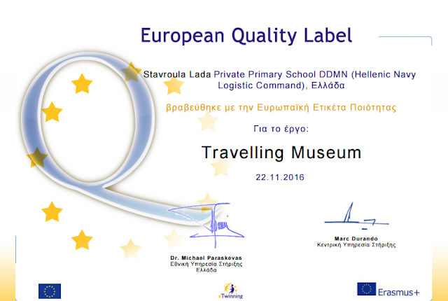 Συγχαρητήρια! Το σχολείο σας βραβεύθηκε με την Ευρωπαϊκή Ετικέτα Ποιότητας για την τελειότητα της εργασίας σας στο έργο eTwinning “Travelling Museum”. Αυτό σημαίνει πως η εργασία σας, η εργασία των μαθητών και του σχολείου σας έχει αναγνωριστεί στο υψηλότερο Ευρωπαϊκό επίπεδο.