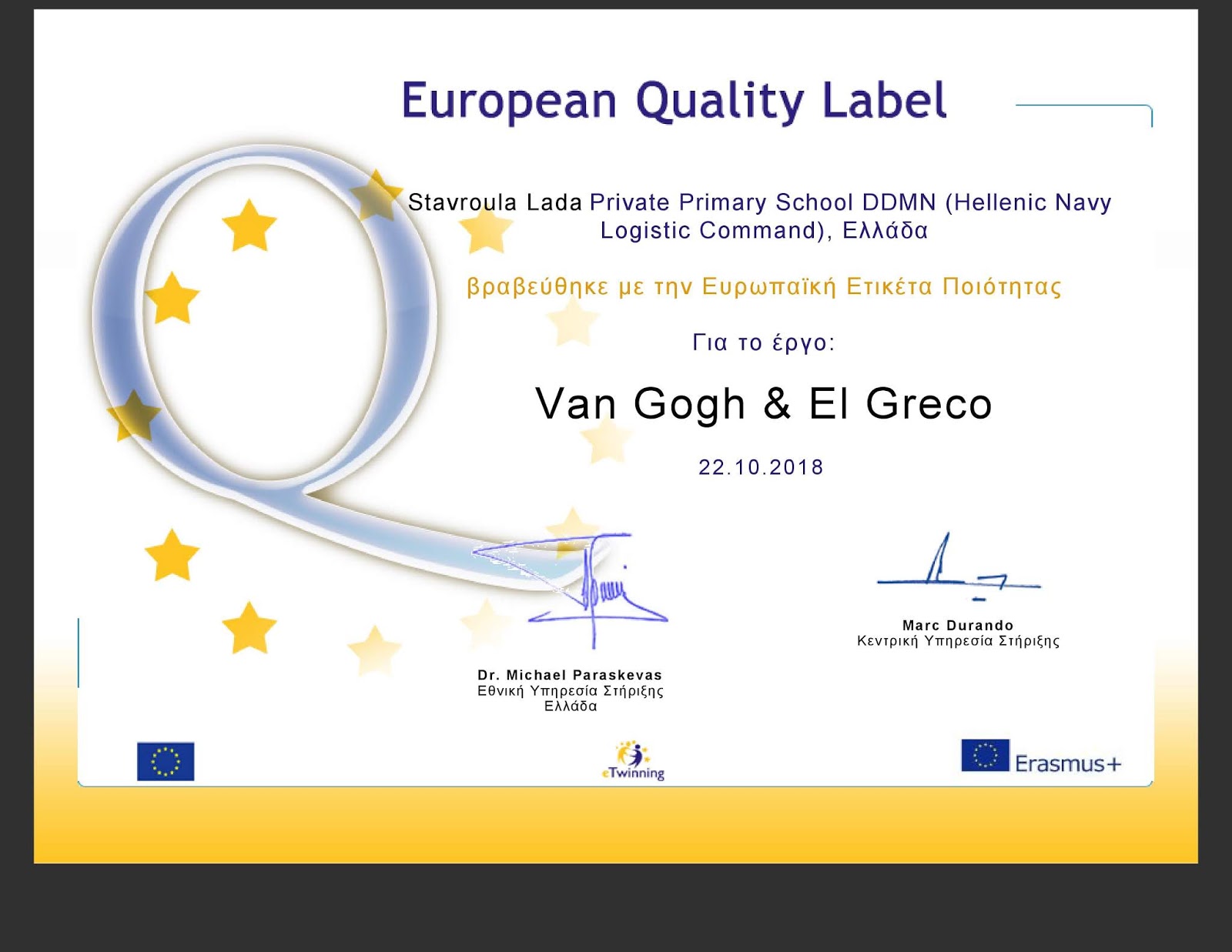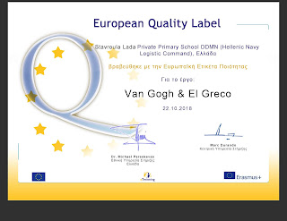 Συγχαρητήρια! Το σχολείο σας βραβεύθηκε με την Ευρωπαϊκή Ετικέτα Ποιότητας για την τελειότητα της εργασίας σας στο έργο eTwinning “Van Gogh & El Greco”. Αυτό σημαίνει πως η εργασία σας, η εργασία των μαθητών και του σχολείου σας έχει αναγνωριστεί στο υψηλότερο Ευρωπαϊκό επίπεδο.
