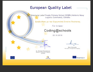 Συγχαρητήρια! Το σχολείο σας βραβεύθηκε με την Ευρωπαϊκή Ετικέτα Ποιότητας για την τελειότητα της εργασίας σας στο έργο eTwinning “Coding@schools”. Αυτό σημαίνει πως η εργασία σας, η εργασία των μαθητών και του σχολείου σας έχει αναγνωριστεί στο υψηλότερο Ευρωπαϊκό επίπεδο.