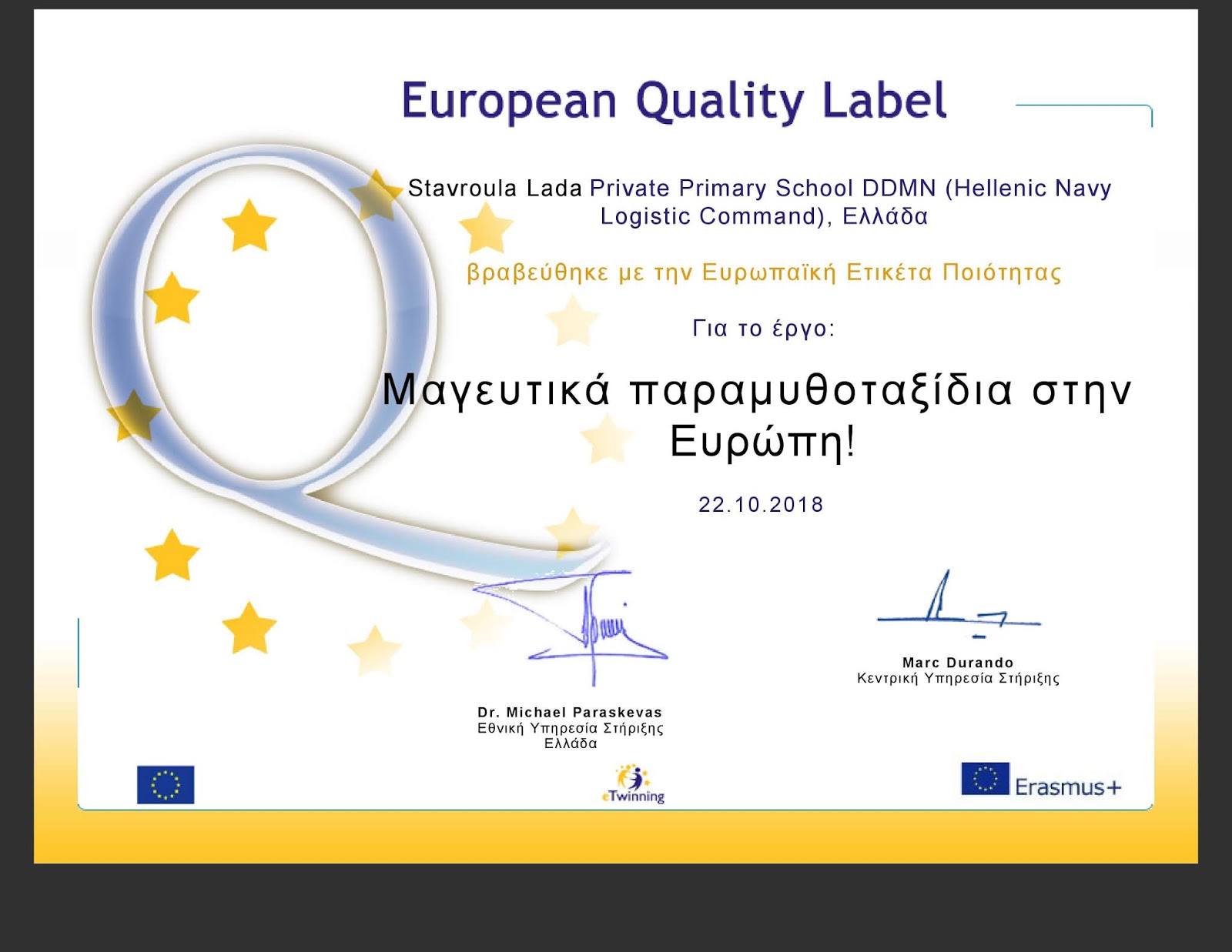 Συγχαρητήρια! Το σχολείο σας βραβεύθηκε με την Ευρωπαϊκή Ετικέτα Ποιότητας για την τελειότητα της εργασίας σας στο έργο eTwinning “Μαγευτικά παραμυθοταξίδια στην Ευρώπη!”. Αυτό σημαίνει πως η εργασία σας, η εργασία των μαθητών και του σχολείου σας έχει αναγνωριστεί στο υψηλότερο Ευρωπαϊκό επίπεδο.