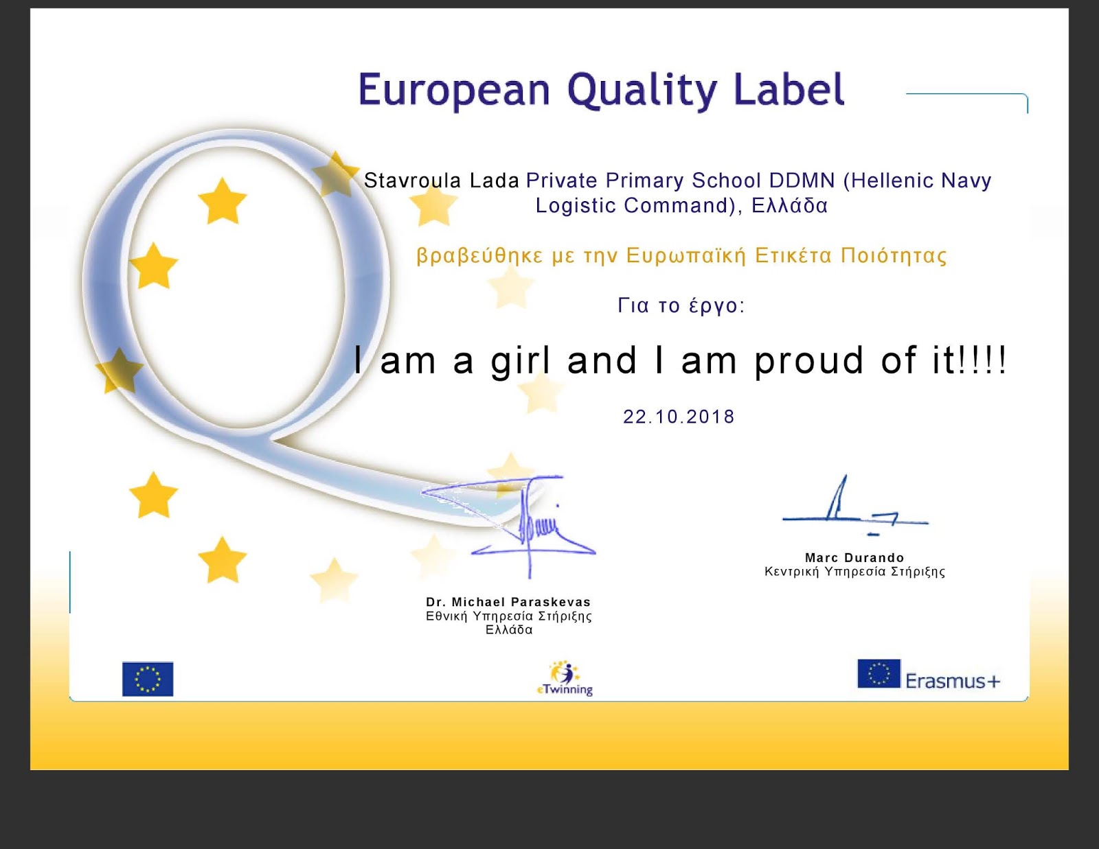 Συγχαρητήρια! Το σχολείο σας βραβεύθηκε με την Ευρωπαϊκή Ετικέτα Ποιότητας για την τελειότητα της εργασίας σας στο έργο eTwinning “I am a girl and I am proud of it!!!!“. Αυτό σημαίνει πως η εργασία σας, η εργασία των μαθητών και του σχολείου σας έχει αναγνωριστεί στο υψηλότερο Ευρωπαϊκό επίπεδο.
