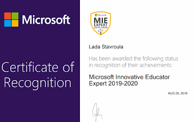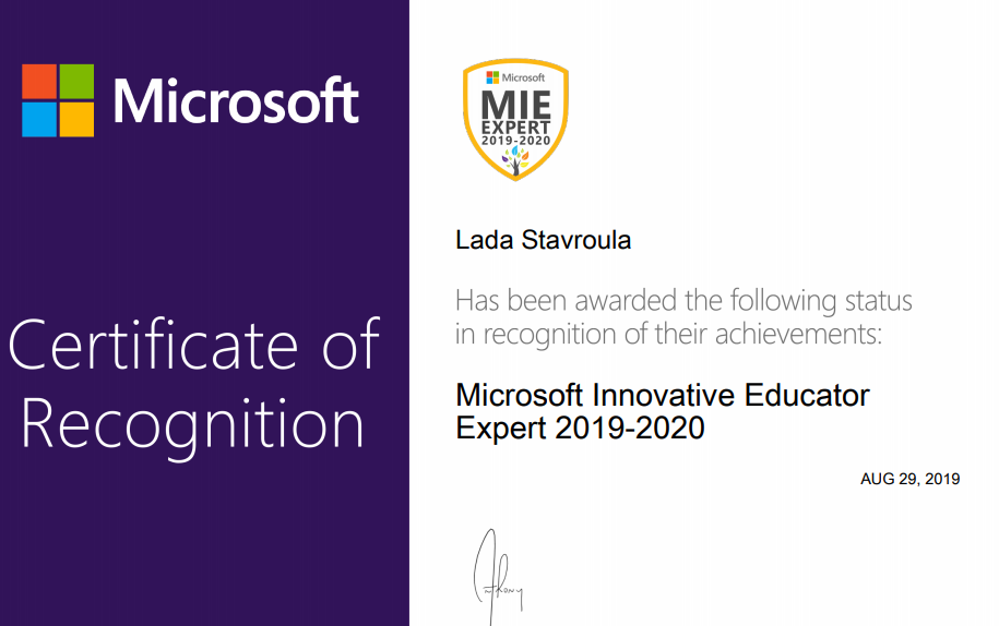 Με χαρά έλαβα από τη Microsoft την τιμητική διάκριση του MIE Expert για το 2019-2020, εξειδικευμένης καινοτόμου εκπαιδευτικού της Microsoft στην Ελλάδα για το νέο σχολικό έτος.