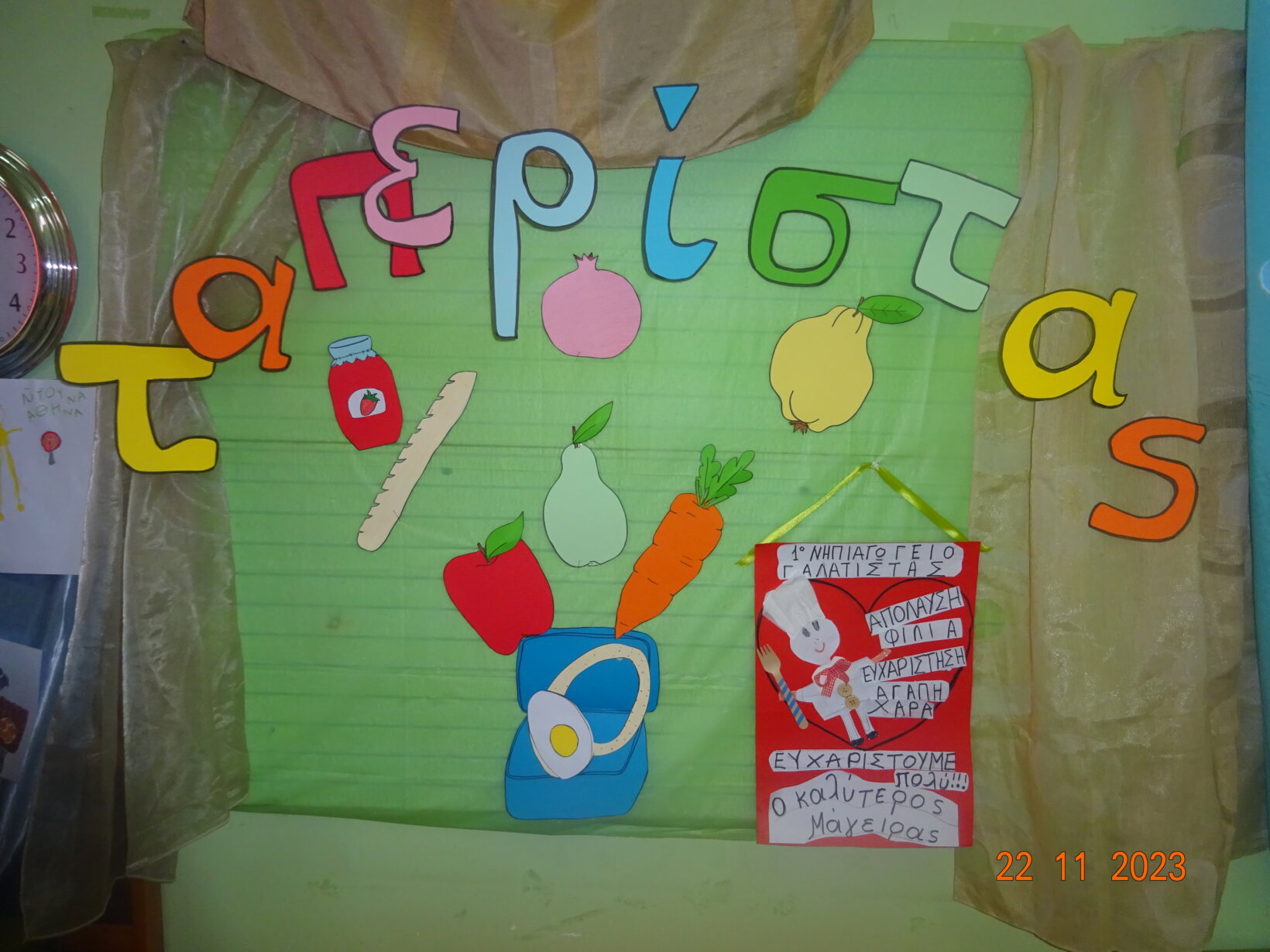 Παρατηρήσαμε και ονοματίσαμε τα καινούρια σκεύη μαγειρικής. Φτιάξαμε σκούφους του σεφ και δραματοποιήσαμε τη σύγχρονη μαγειρική διαδικασία.