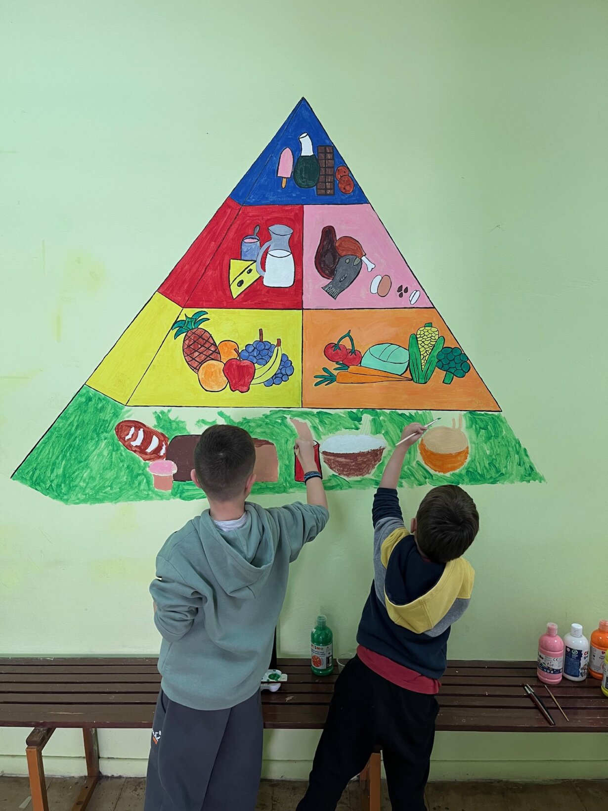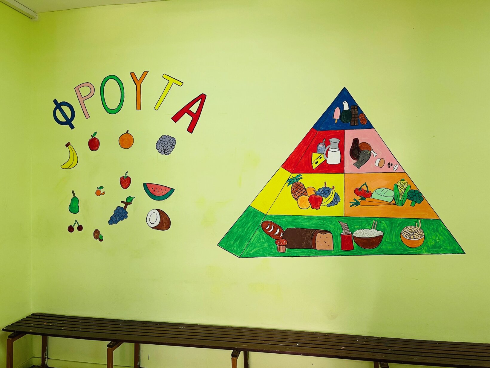 Αυτό μας γέννησε την ιδέα, να αποτυπώσουμε την διατροφική πυραμίδα και κάπου που θα την βλέπουν όλοι. Οι τοίχοι του σχολείου μας γέμισαν με υγιεινές τροφές όπως φρούτα και λαχανικά και μια μεγάλη πυραμίδα διατροφής ζωγραφισμένη όλη στο χέρι. Σε αυτό βοήθησε και η συνεργασία με το συστεγαζόμενο Δημοτικό Σχολείο Αραχναίου όπου από την πρώτη στιγμή υπήρξε θετικά προσκείμενο να συνεργαστεί μαζί μας. Έτσι έγινε πραγματικότητα μια αλλαγή που προήλθε από τους ίδιους τους μαθητές και κοσμεί πλέον τους σχολικούς τοίχους για να μας θυμίζει όσα είναι σωστά για την υγεία μας.
