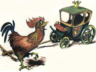 -Αυτό το αμαξάκι µου αρέσει! είπε ο φαντασμένος κόκκορας. Μ’ αυτό το αμάξι πρέπει να ταξιδέψω σ’ όλο τον κόσμο, να µε δουν όλες οι κότες και τα κοκκόρια και να θαυμάσουν την ομορφιά, τη δύναμη και τη μεγαλοπρέπειά µου.