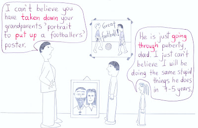 - He has put up posters on all walls in his bedroom.