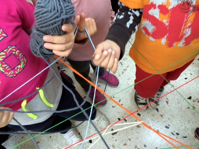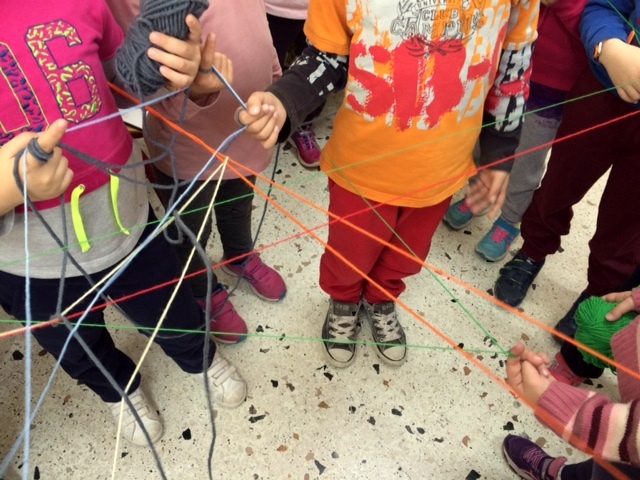 Ένα κουβάρι, ένα χρώμα, ένα συναίσθημα, ένας μαθητής….η σειρά δεν έχει καμιά σημασία… για συναισθήματα μιλάμε. Ξεκίνησε η “πηγή” και σε κάθε μαθητή που έβλεπε στο πρόσωπό του το συναίσθημα που ταίριαζε το χρώμα του κουβαριού, το τύλιγε μια φορά γύρω από το δάχτυλό του και προχωρούσε στον επόμενο μαθητή με το ίδιο συναίσθημα.