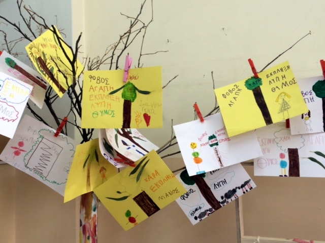 Δε σταματήσαμε όμως εκεί..Πήραμε ένα χαρτόνι και ζωγραφίσαμε ένα δέντρο, όπως εμείς το φανταζόμαστε…κολλήσαμε και φύλλα που μαζέψαμε από την αυλή του σχολείου μας. Γράψαμε τα έξι συναισθήματα και θα προσπαθήσουμε να εκφραζόμαστε κάθε φορα που νιώθουμε ένα από αυτά ώστε να μπορέσουμε να τα διαχειριστούμε.
