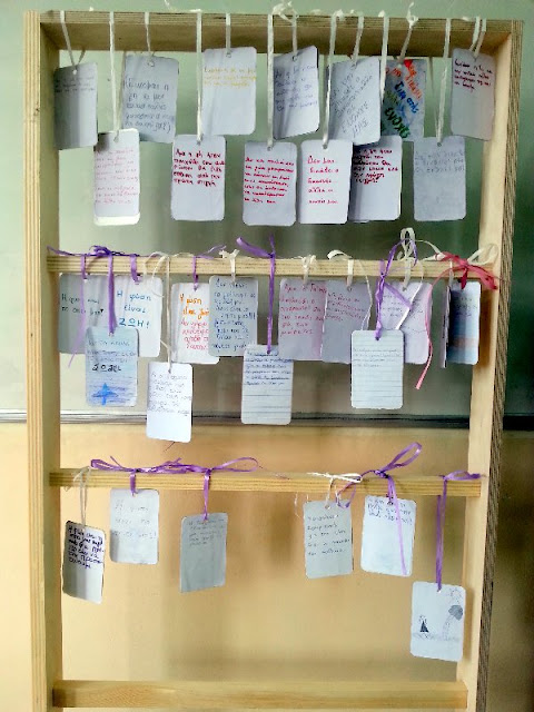 Για αυτή λοιπόν την προσπάθεια χρειαστήκαμε φυσικά την πολύτιμη βοήθεια του κ. Κώστα της “Ξυλομανίας” για την κατασκευή του πλαισίου όπου θα κρεμούσαμε και εμείς τα δικά μας αφιερώματα με τις ευχές μας. Χρησιμοποιήσαμε ξύλινα δείγματα από ντουλάπια κουζίνας όπου και θα ζωγραφίζαμε τα Τορίι και πίσω από αυτά θα γράφαμε τις ευχές μας. Εργαστήκαμε και πάλι ομαδικά . Χρησιμοποιήσαμε ξύλινα δείγματα, από αυτά που έχουν οι ξυλουργοί για να δείχνουν τα χρώματα και τις ποιότητες του - Η πρώτη ομάδα ονομάστηκε «Φιλόσοφοι» επειδή αυτή ανέλαβε να βρει πρωτότυπες και «βαθυστόχαστες » ευχές για όλους.