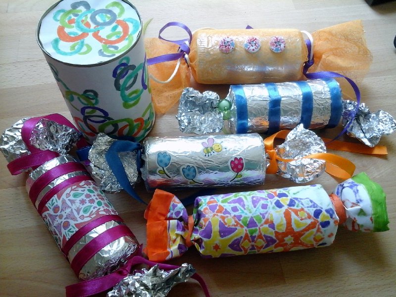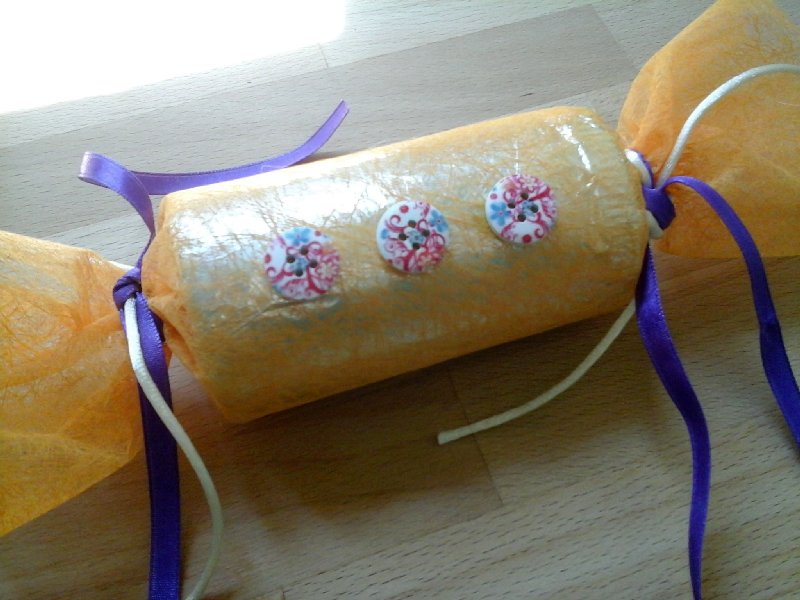 Καλύπτουμε τον κύλινδρο με αλουμινόχαρτο, δημιουργώντας το σχήμα της καραμέλας και τον στολίζουμε με ό,τι υλικα έχουμε…π.χ. κορδέλες.