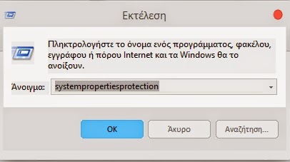 Καταρχήν, πατάμε συγχρόνως τα πλήκτρα: κουμπί των Windows + R για να μας εμφανίσει το παράθυρο “εκτέλεση” των Windows. Εκεί, πληκτρολογούμε την φράση: – systempropertiesprotection – και πατάμε OK.