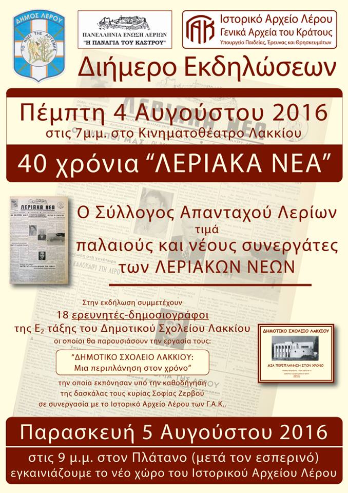Φέτος η εφημερίδα «ΛΕΡΙΑΚΑ ΝΕΑ» συμπλήρωσε 40 χρόνια κυκλοφορίας. Το Ιστορικό Αρχείο Λέρου των ΓΑΚ σε συνεργασία με τον Δήμο Λέρου και την Πανελλήνια Ένωση Λερίων «Η Παναγιά του Κάστρου» διοργάνωσε μία εκδήλωση προκειμένου να τιμηθούν οι συνεργάτες της εφημερίδας. Σε αυτό το πλαίσιο οι μαθητές του τμήματος Ε2 του Δημοτικού Σχολείου Λακκίου έλαβαν μέρος στην εκδήλωση παρουσιάζοντας το σχέδιο εργασίας τους με θέμα: «ΔΗΜΟΤΙΚΟ ΣΧΟΛΕΙΟ ΛΑΚΚΙΟΥ: ΜΙΑ ΠΕΡΙΠΛΑΝΗΣΗ ΣΤΟΝ ΧΡΟΝΟ». Η εκδήλωση πραγματοποιήθηκε την Πέμπτη 4 Αυγούστου 2016 στο Δημοτικό Κινηματοθέατρο Λέρου.