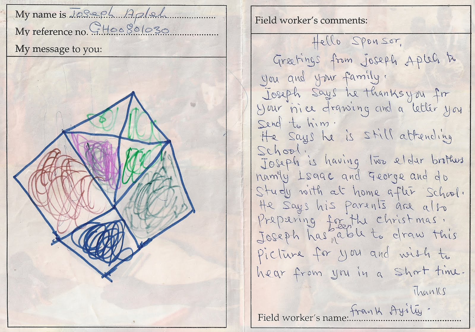 Ο μικρός Τζόζεφ ζει στην κοινότητα Γκα, της Γκάνα, είναι 6 ετών και όπως μας γράφει, του αρέσει να μελετά Αγγλικά μετά το σχολείο με τους φίλους του. Αγαπημένο του φαγητό είναι το ρύζι με το βραστό κρέας και ονειρεύεται να γίνει γιατρός όταν θα μεγαλώσει.