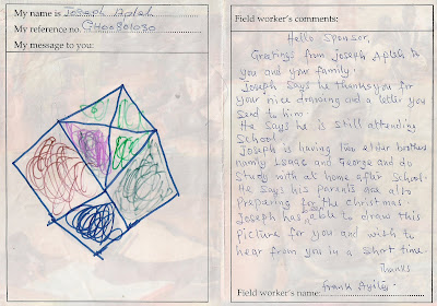 Πριν από λίγους μήνες το 22ο Γυμνάσιο Πατρών και το Γ2 του 12ου , στα πλαίσια του μαθήματός μας, γίναμε ανάδοχοι γονείς του μικρού Τζόζεφ από την Γκάνα. Όλο αυτό το διάστημα περιμέναμε με αγωνία ένα μικρό σημείωμα από τα χεράκια του. Πράγματι αξιωθήκαμε στις 13 Ιουνίου να λάβουμε ένα ευχαριστήριο μήνυμα από το μικρό μας ανάδοχο. Σας το παραθέτω για να χαρείτε μαζί μας.