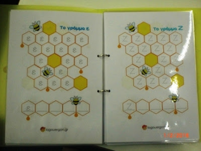 Σε άλλο ντοσιέ έβαλα διάφορες πλαστικοποιημένες σελίδες προγραφής, γραφής και ΑΒ. Πρόσφατα η καλή μου Τάνια ανέβασε μια πολύ ωραία πρόταση εδώ και τη χρησιμοποίησα. Στην μπροστά σελίδα καλούνται τα μικρά είτε να συμπληρώσουν με καπάκια την ΑΒ ή να πάρουν τα γράμματα από την από πίσω και να τα κολλήσουν ή να συνθέσουν την ΑΒ (πίσω σελίδα).